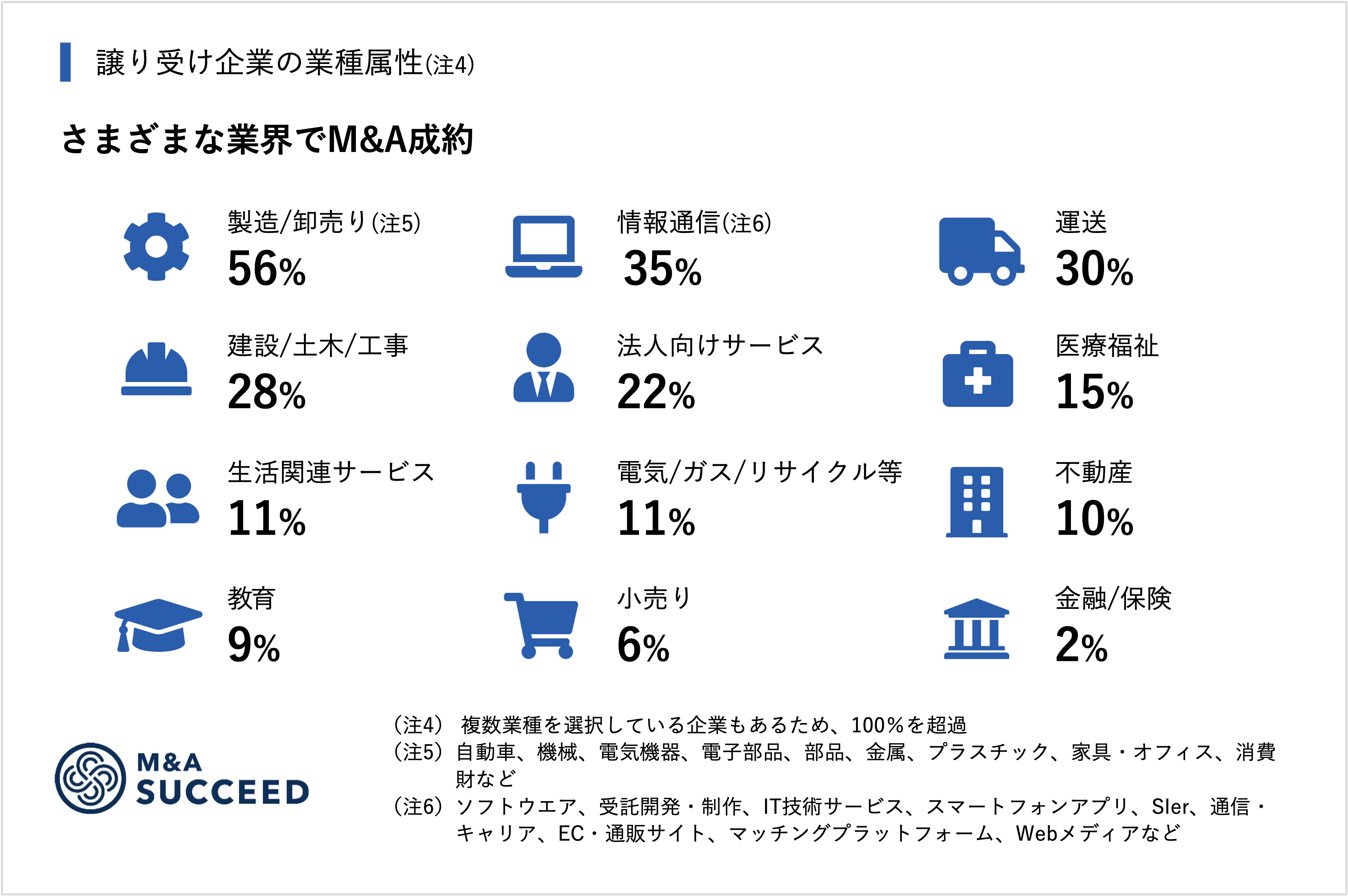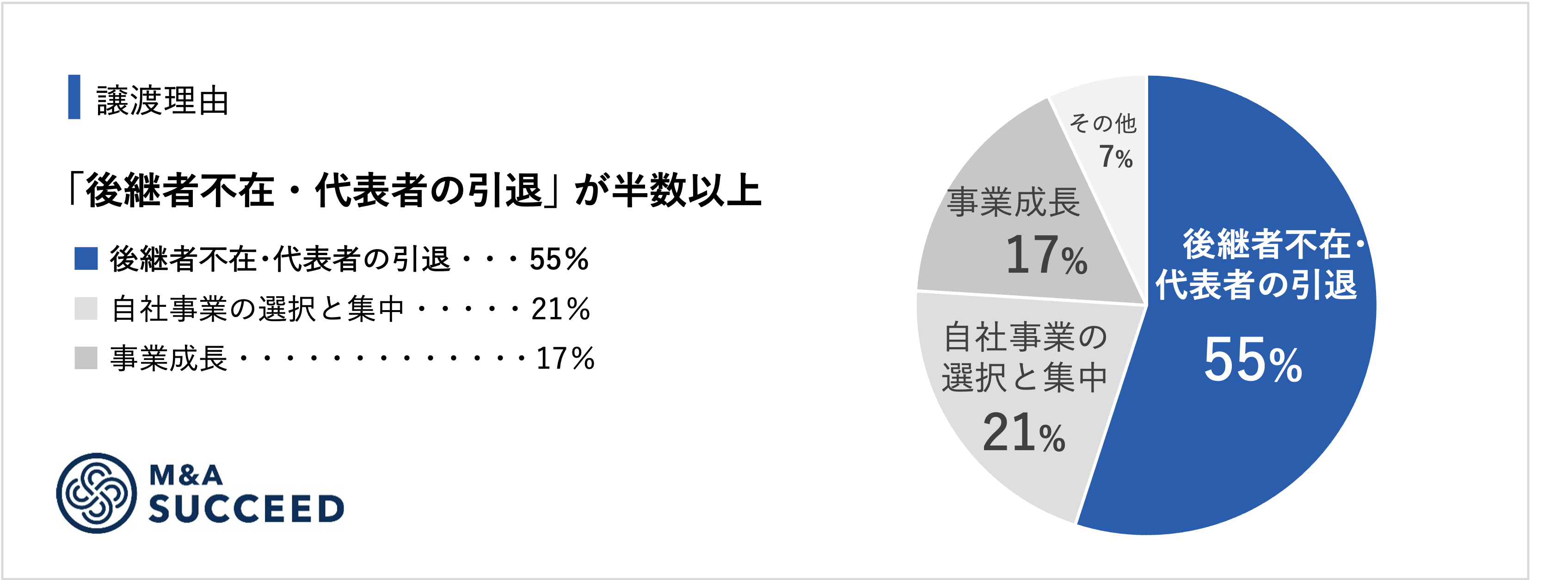 ・譲渡理由:「後継者不在・代表者の引退」55%、「自社事業の選択と集中」21%、「事業成長」17%