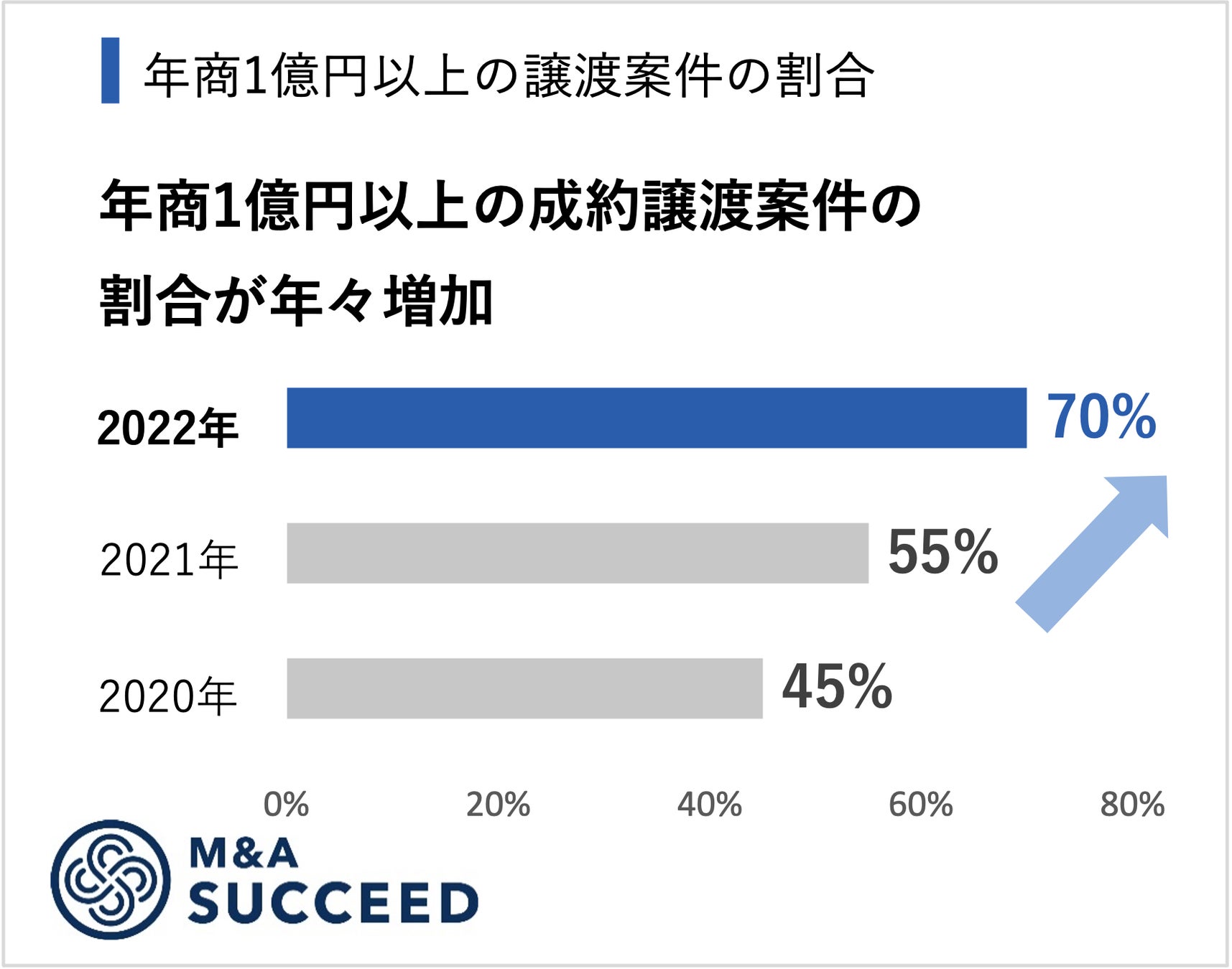 Visionalグループの株式会社M&Aサクシード(所在地:東京都渋谷区/代表取締役社長:金 蓮実)が運営する法人・審査制M&Aマッチングサイト「M&Aサクシード」(https://ma-succeed.jp/)は、2022年1月から12月までに「M&Aサクシード」を通じて成約したM&A全件の内訳を公開いたします。2022年のM&A成約案件のうち、譲渡案件の70%が年商1億円以上、譲り受け企業の67%が年商10億円以上でした。年商1億円以上の成約譲渡案件の割合は、2020年45%、2021年55%、2022年70%と年々増加しています。また、57%が譲渡案件の掲載から成約まで半年以内、63%が譲渡企業と譲り受け企業の所在都道府県が異なる隔地間M&Aで、異業種による成約は50%でした。この結果は、経営者自身がインターネット上で一度に全国のM&Aの可能性を探せるM&Aマッチングサイトならではの特徴といえます。