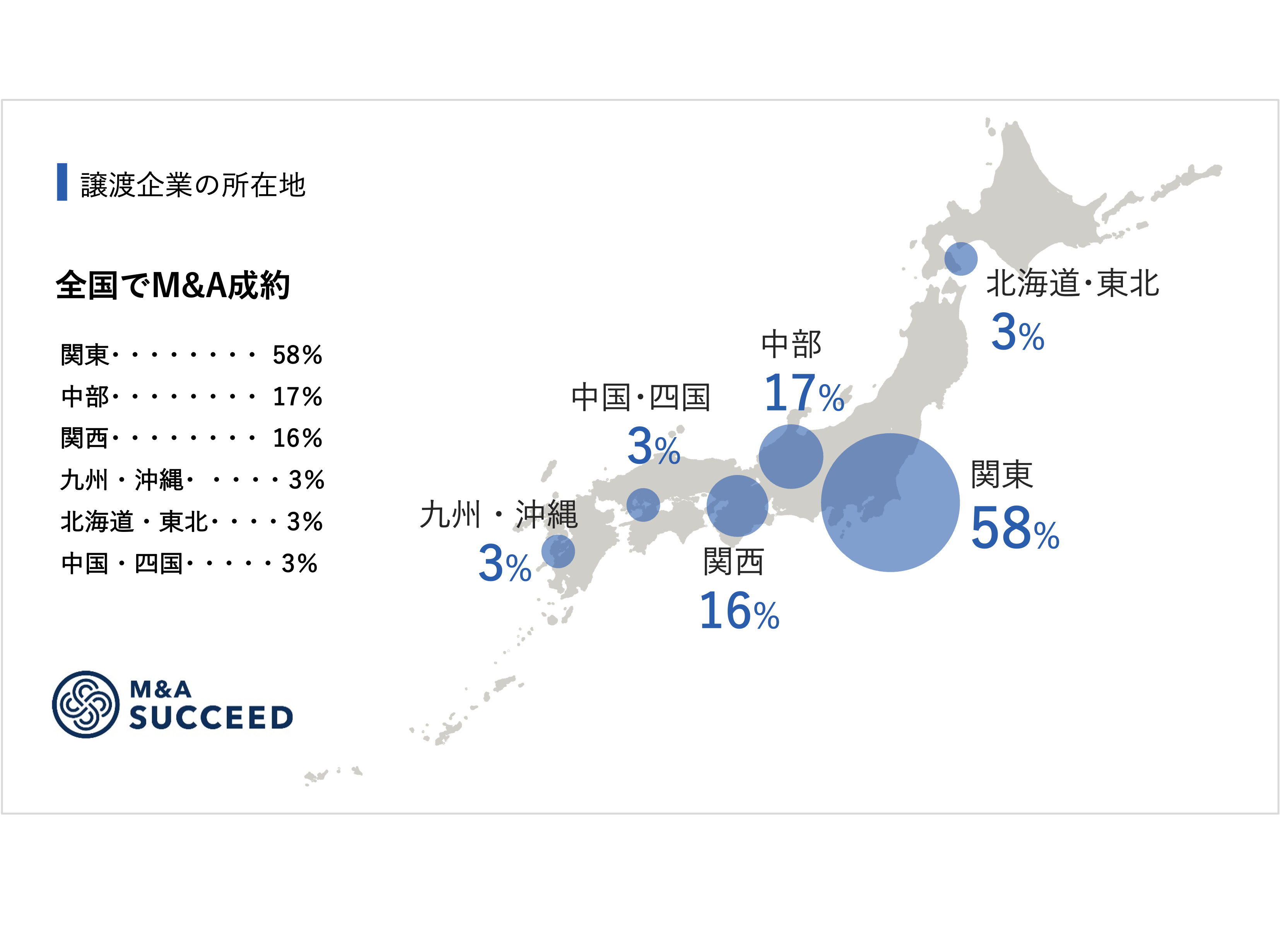 ・譲渡企業の所在地:全国(関東58%、中部17%、関西16%、九州・沖縄3%、北海道・東北3%、中国・四国3%)