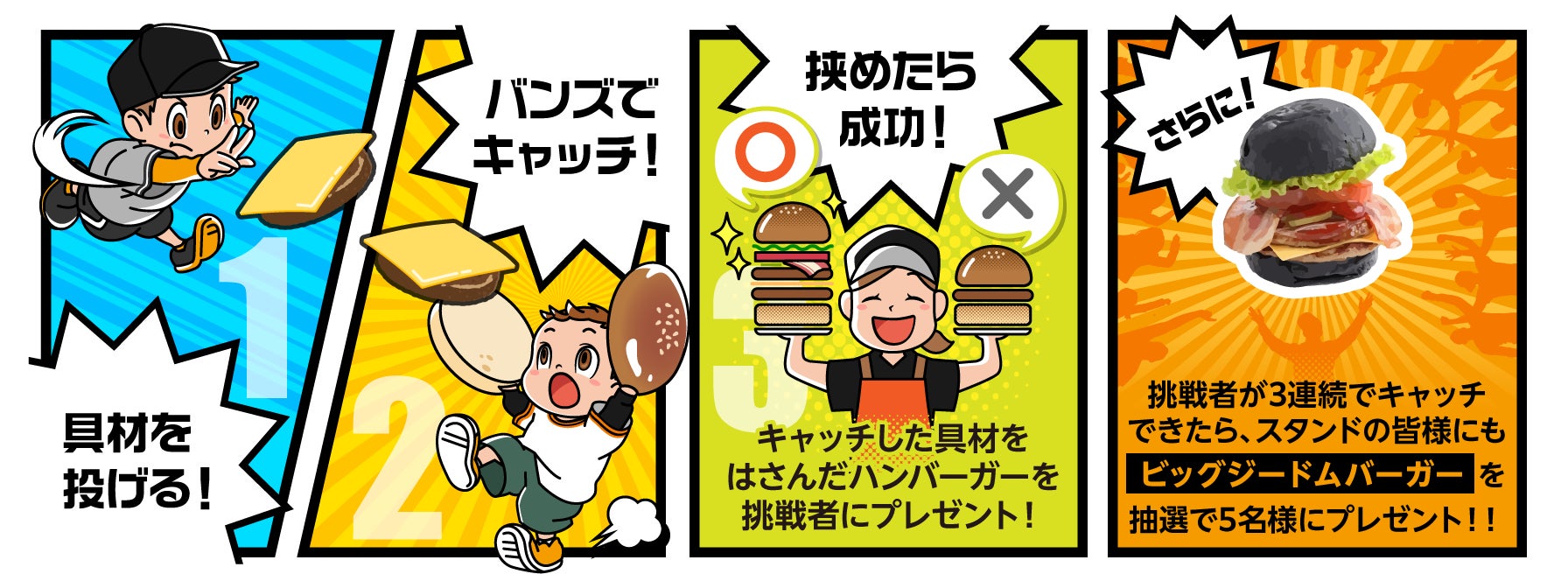 抽選で選ばれた挑戦者1組が「スロー役」と「キャッチ役」に分かれ、協力してハンバーガーを完成させる参加型イベントです。スロー役は具材のイラストが描かれたプレート(全3種類)を投げ、キャッチ役はバンズ型のグラブでプレートを挟んでキャッチします。挑戦者には、キャッチした具材とパティ1枚を挟んだオリジナルバーガーをプレゼントします。また、挑戦者が3種類全ての具材キャッチに成功した場合は、当日の来場者の中から抽選で5名に「ビッグジードムバーガー」の引換券をプレゼントします。