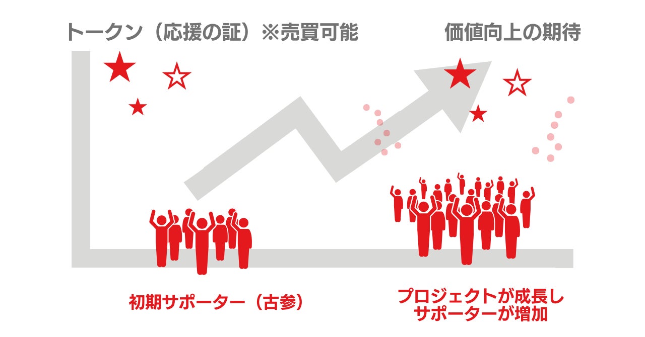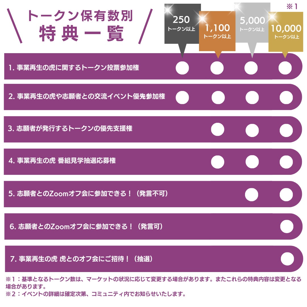 支援者にはトークンが配布され、トークンを持ち続けることで「事業再生の虎の志願者が発行するトークンの優先購入権」や「事業再生の虎や志願者との交流イベントにご招待」など、さまざまなメリットが受けられます。