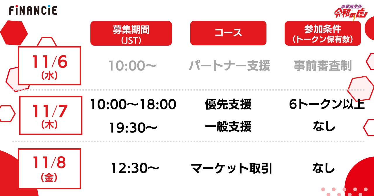 株式会社フィナンシェ(東京都渋谷区、代表取締役:國光 宏尚)は、有限会社カグヤマ商会(愛知県日進市、代表:後藤 和良)が運営するビジネス再生プロジェクト『事業再生の虎』が、トークンプラットフォーム「FiNANCiE」でトークンを発行・販売することを決定しました。一般支援枠の申込は、2024年11月7日(木)19:30から開始予定です。