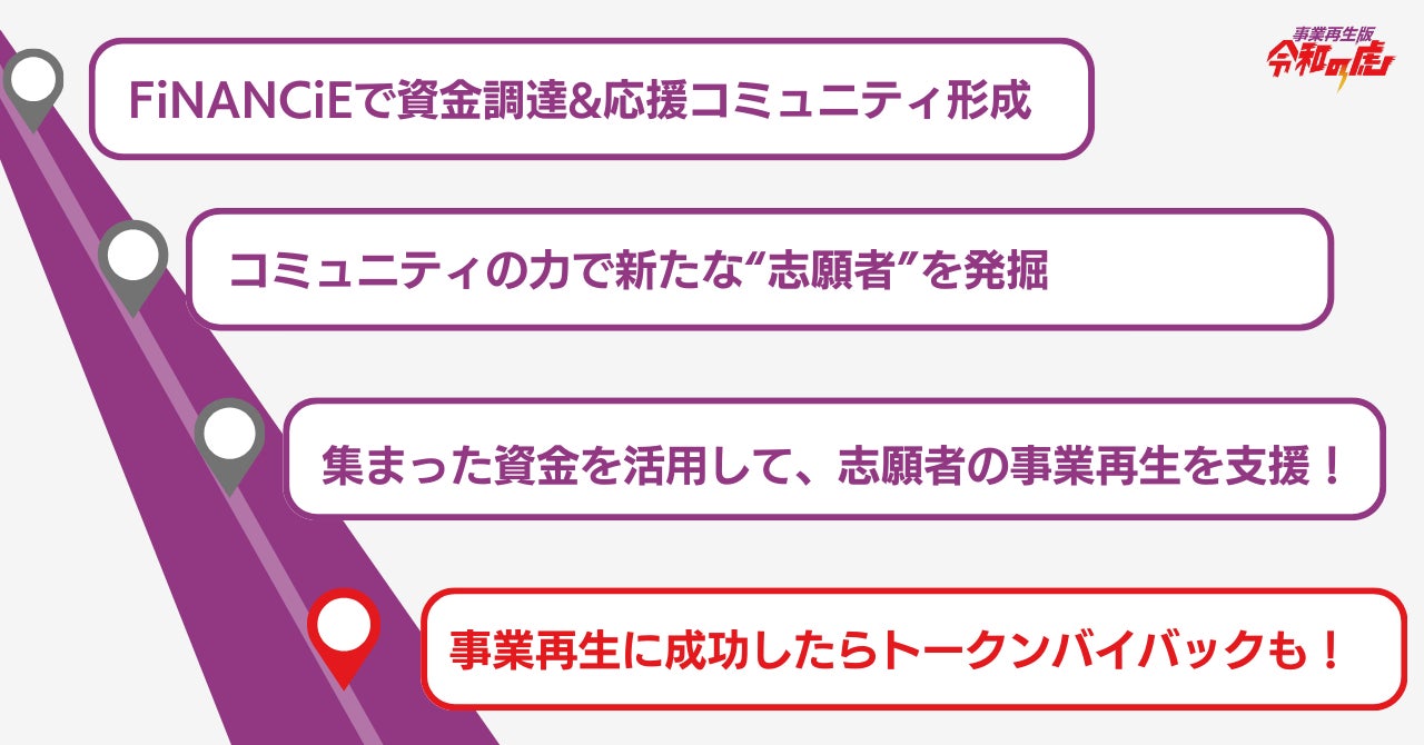 また、今後番組に出演した"志願者"が希望した場合、志願者の事業を応援するトークンをFiNANCiE上で発行・販売し、事業再生の虎トークン保有者にそのトークンの優先支援権を付与するなどの展開も検討しています。