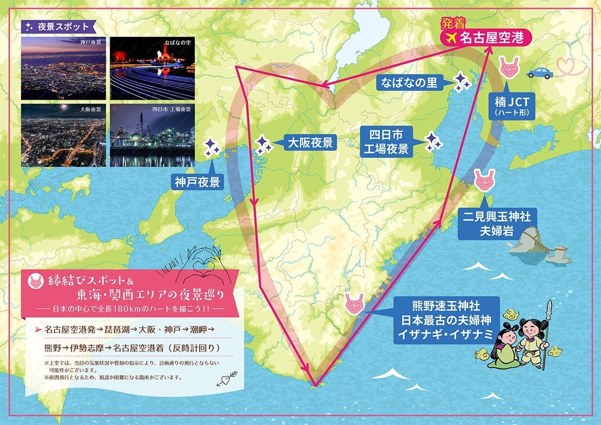 今回ご用意する遊覧チャーター便のルートは、東海・関西エリアの夜景をハート型に巡るコースで、四日市の工場群や大阪・神戸の夜景をお楽しみいただきます。また、運航管理者による飛行ルートの生解説や、当日使用する機体カラーをリクエストできる、FDAならではのオプションも用意しており、組み合わせ次第でオリジナルの遊覧フライトを実現できます。