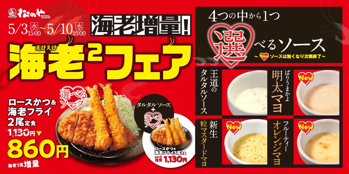 海老好きの皆様お待たせいたしました!!松のやのゴールデンウイークと言えばこれ!「海老えびフェア」を1週間限定で開催いたします。プリップリの海老の食感が楽しめる松のや自慢の海老フライが1尾分無料になります。