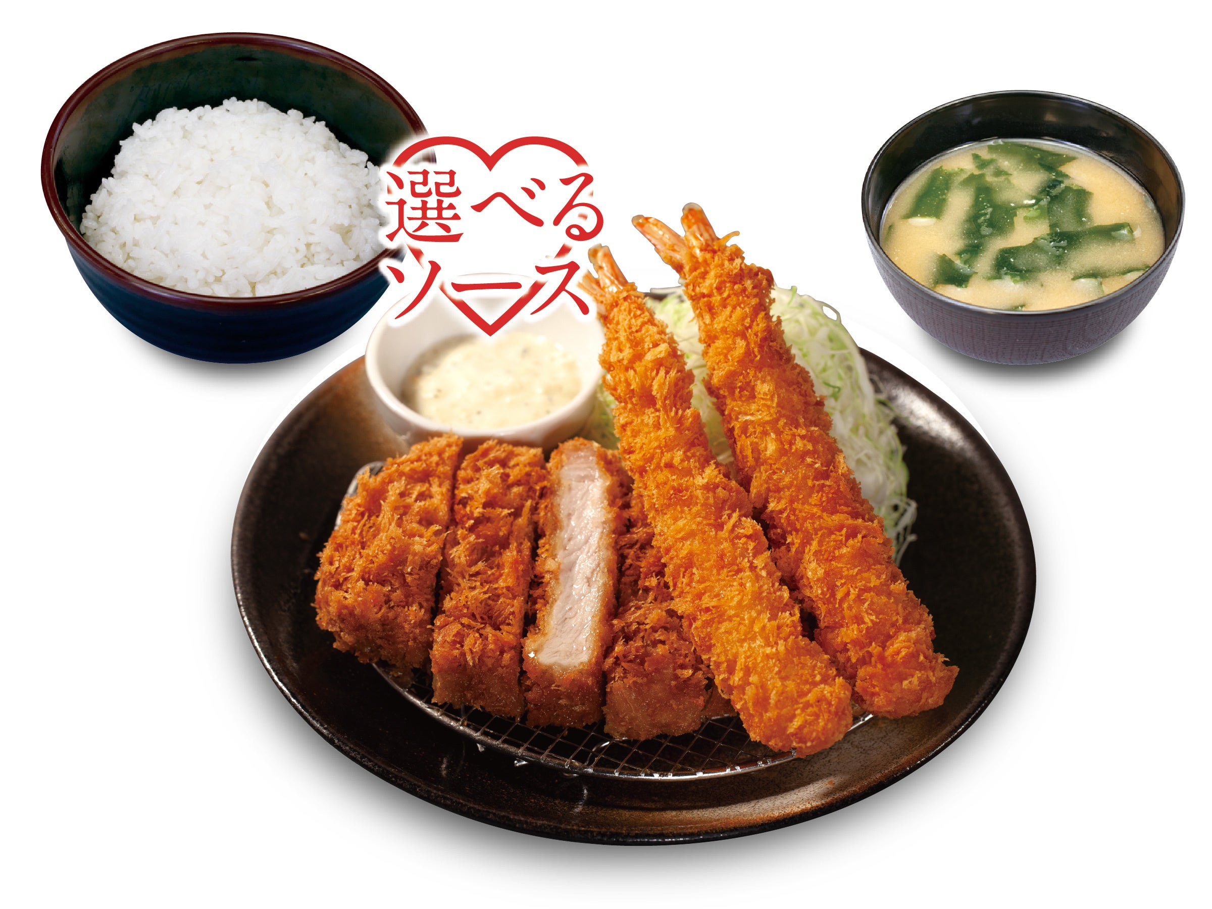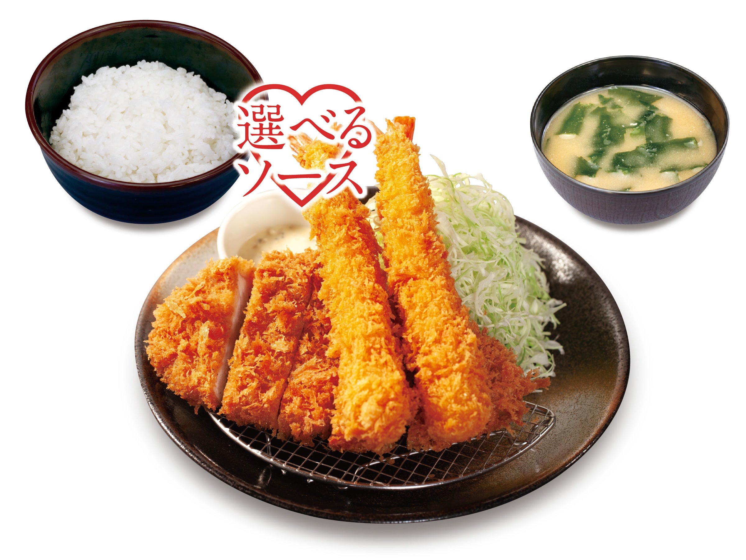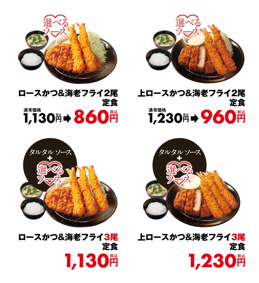商品名 ロースかつ&海老フライ2尾定食 1,130円 → 860円 上ロースかつ&海老フライ2尾定食 1,230円 → 960円 ロースかつ&海老フライ3尾定食 1,130円 上ロースかつ&海老フライ3尾定食 1,230円 ※全て税込価格です。また、店内・お持ち帰りの税込価格は同一です。 ※お持ち帰りいただけます。お持ち帰りのみそ汁は、別途60円でお買い求めいただけます。 ※本キャンペーン期間中の「ロースかつ&海老フライ1尾定食」の販売はいたしません。 ※「上ロースかつ&海老フライ2尾or 3尾定食」は松屋併設店舗では導入しません。 ※沖縄店舗は「ロースかつ&海老フライ2尾定食」のみの販売、「選べるソース」は導入しません。 ※選べるソースは無くなり次第終了となりますのでご了承ください。