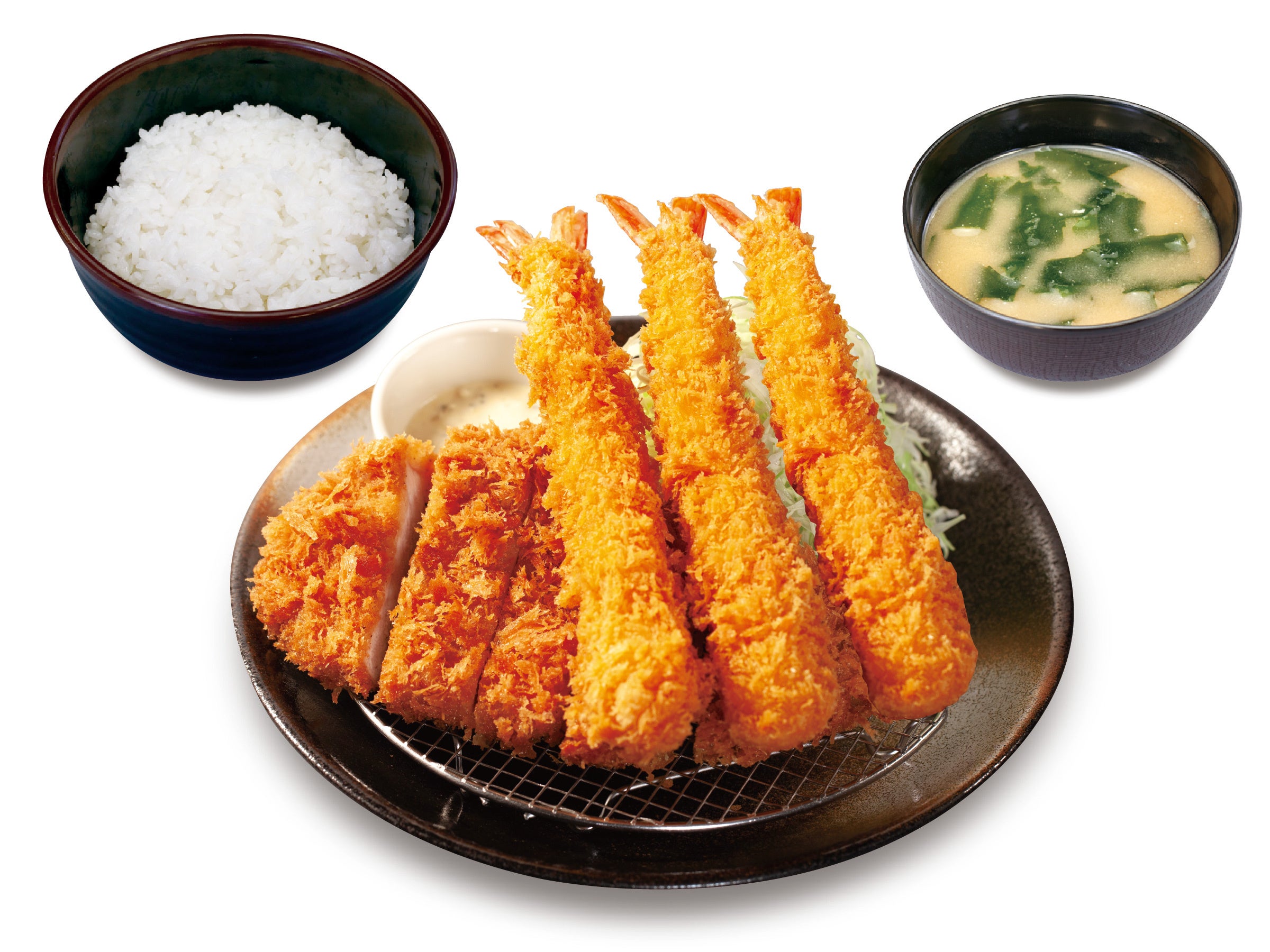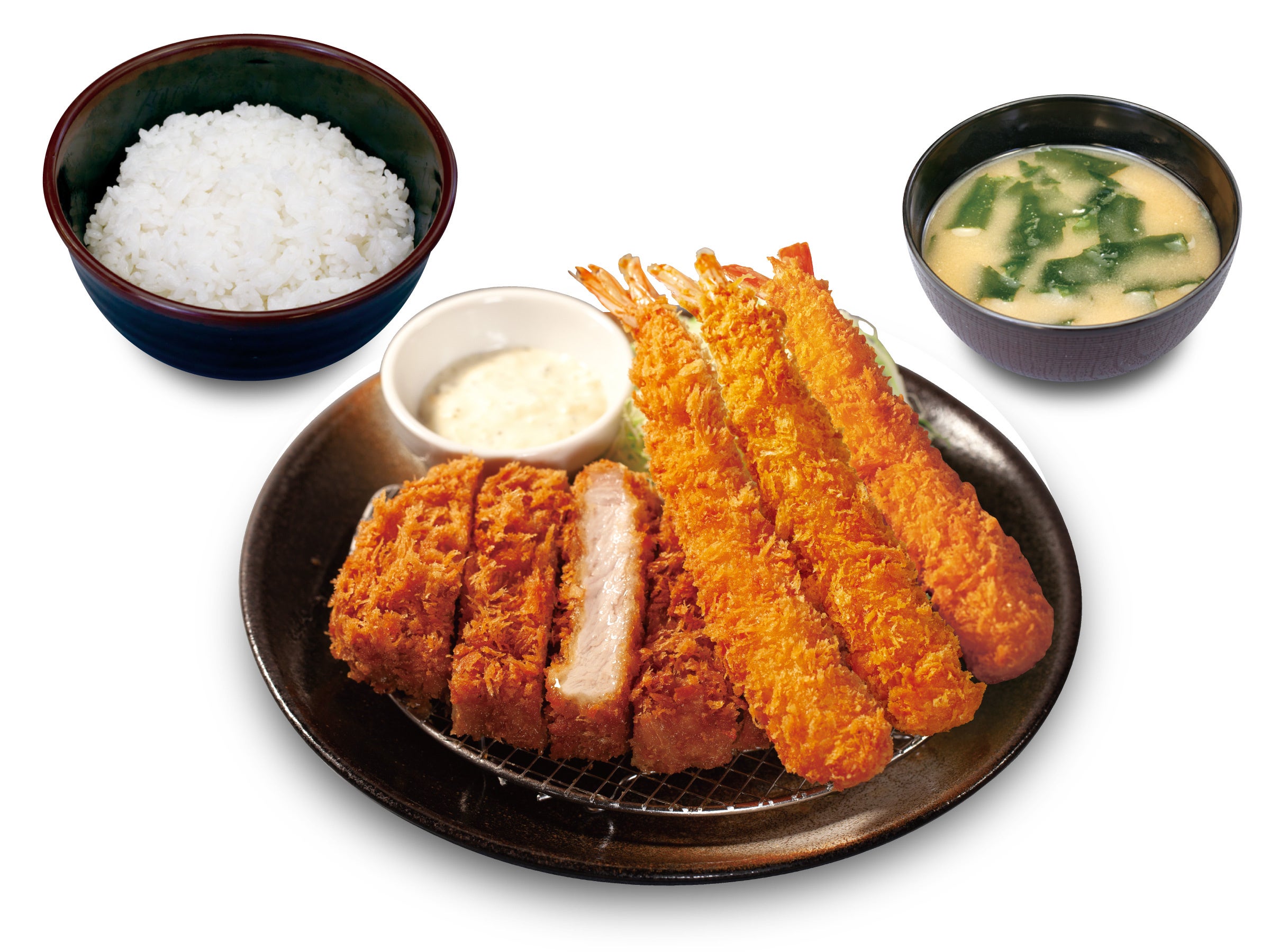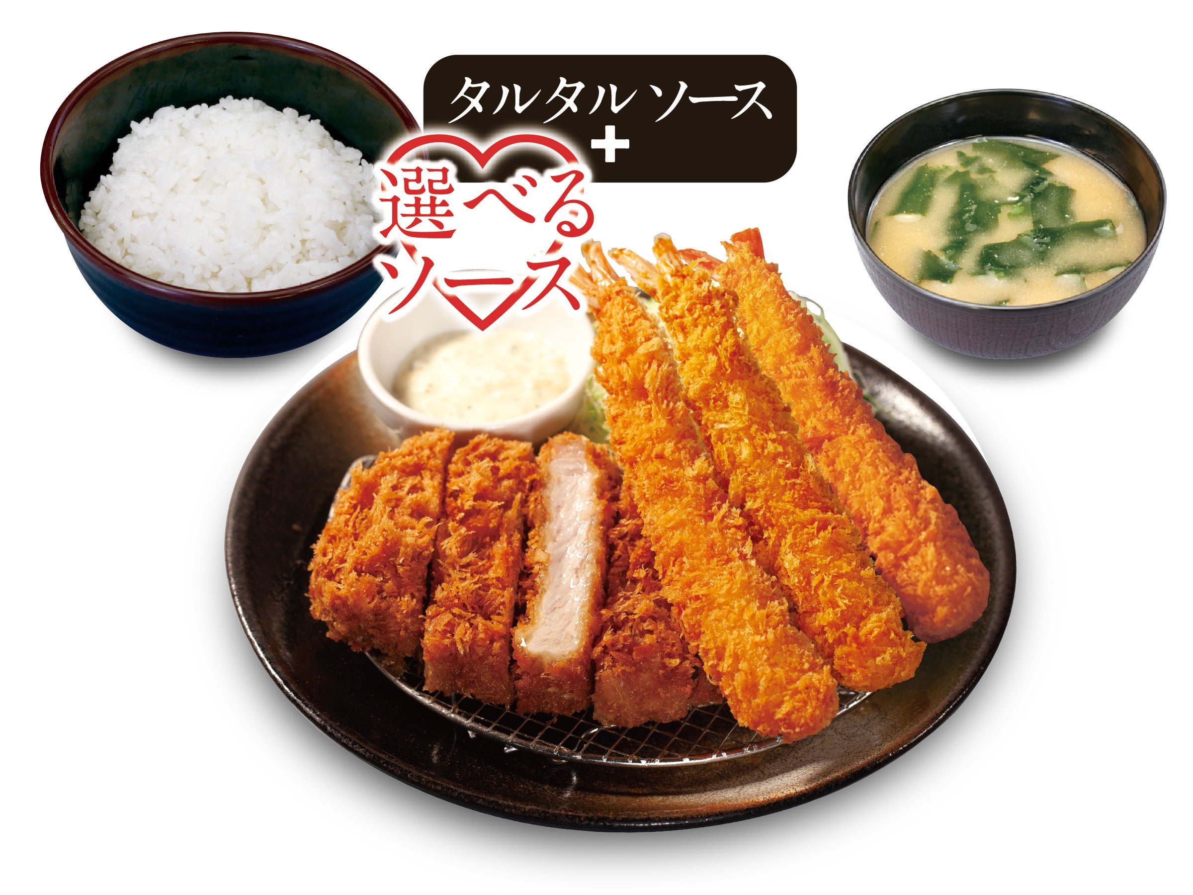 商品名 ロースかつ&海老フライ2尾定食 1,130円 → 860円 上ロースかつ&海老フライ2尾定食 1,230円 → 960円 ロースかつ&海老フライ3尾定食 1,130円 上ロースかつ&海老フライ3尾定食 1,230円 ※全て税込価格です。また、店内・お持ち帰りの税込価格は同一です。 ※お持ち帰りいただけます。お持ち帰りのみそ汁は、別途60円でお買い求めいただけます。 ※本キャンペーン期間中の「ロースかつ&海老フライ1尾定食」の販売はいたしません。 ※「上ロースかつ&海老フライ2尾or 3尾定食」は松屋併設店舗では導入しません。 ※沖縄店舗は「ロースかつ&海老フライ2尾定食」のみの販売、「選べるソース」は導入しません。 ※選べるソースは無くなり次第終了となりますのでご了承ください。