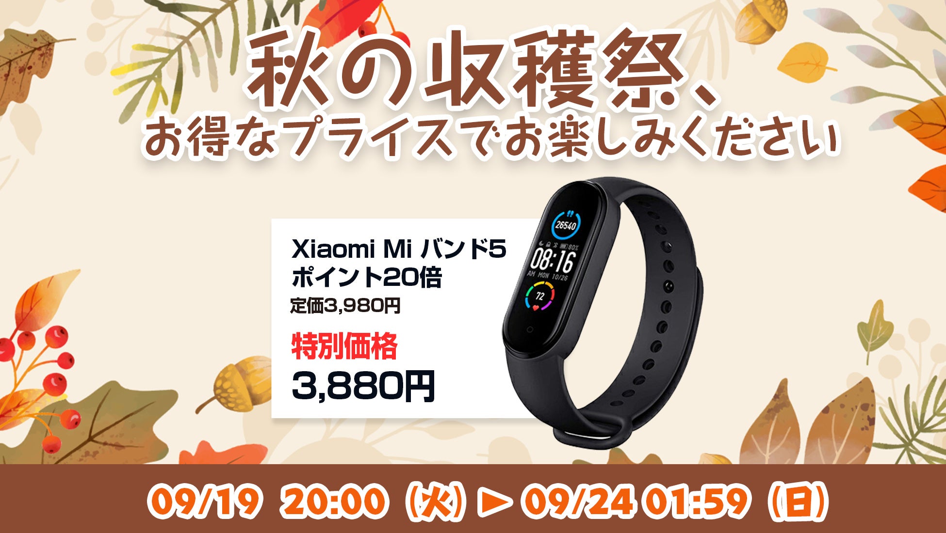 楽天市場「Show !t」は9月19日(火)20時から、シャオミのMiバンド5を通常価格3,980円(税込)のところ3,880円(税込)の特別価格で販売し、さらにご購入の方にポイント20倍プレゼントを実施します。また、9月19日(火)20:00~9月24日(日)01:59まで開催される、楽天お買い物マラソンに参加し、ポイント10倍プレゼント(一部商品を除く)を実施します。この機会にシャオミのスマートバンドMiバンド5でポイントをザクザク貯めましょう。