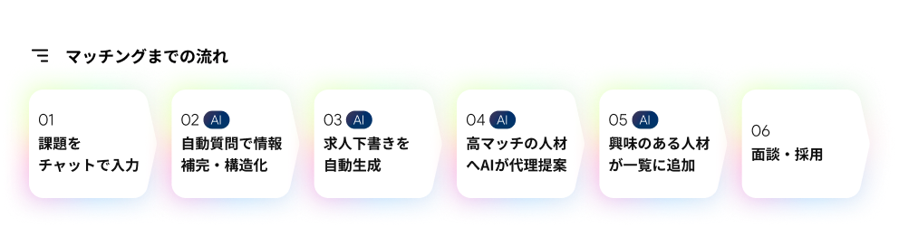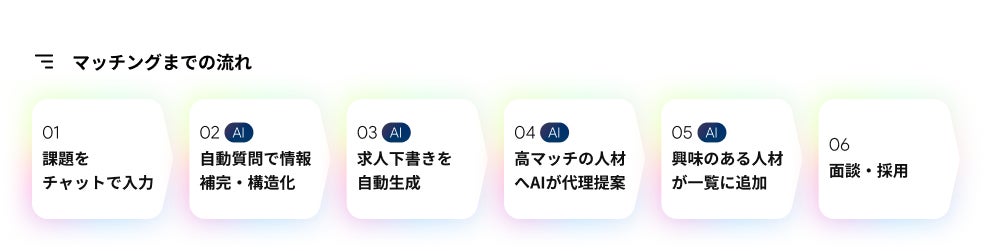 従来のように求人票を作成したり、候補者にスカウトを送る必要はなく、社内に採用の専門担当がいなくても、即座に人材アサインが可能になります。要件定義が不要で即対応可能、思いがけないアプローチの提案により発想が広がる、人材登用のハードルを下げ、埋もれた課題にも対応しやすくなります。