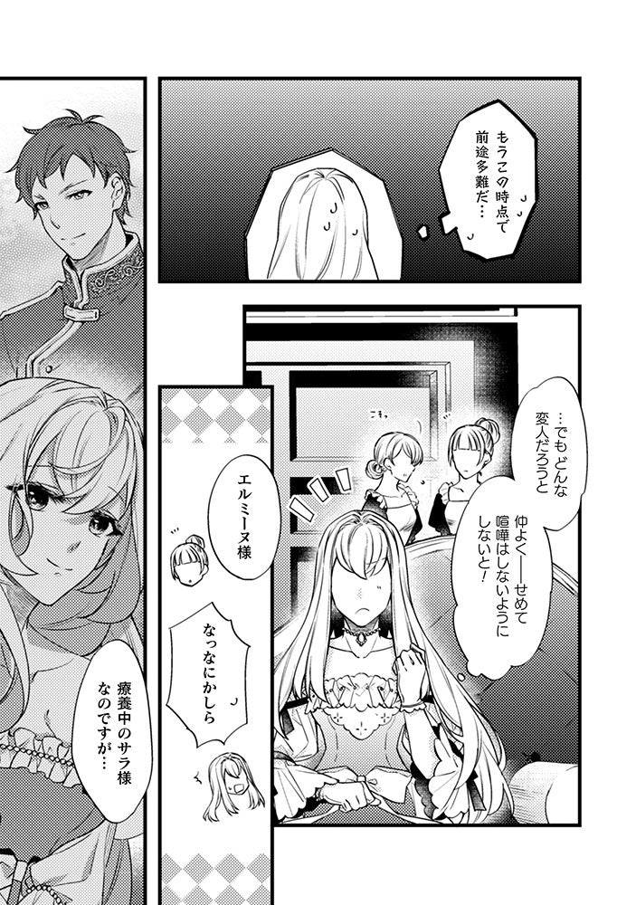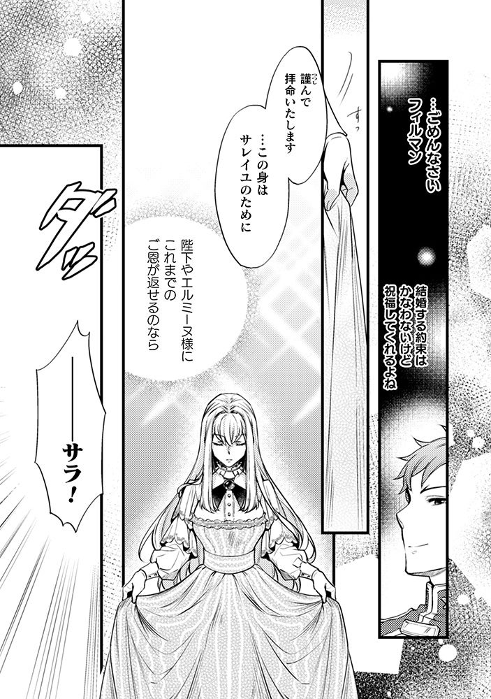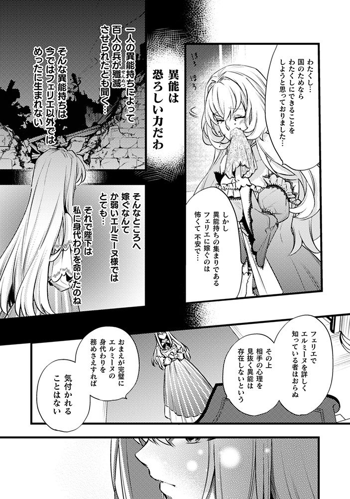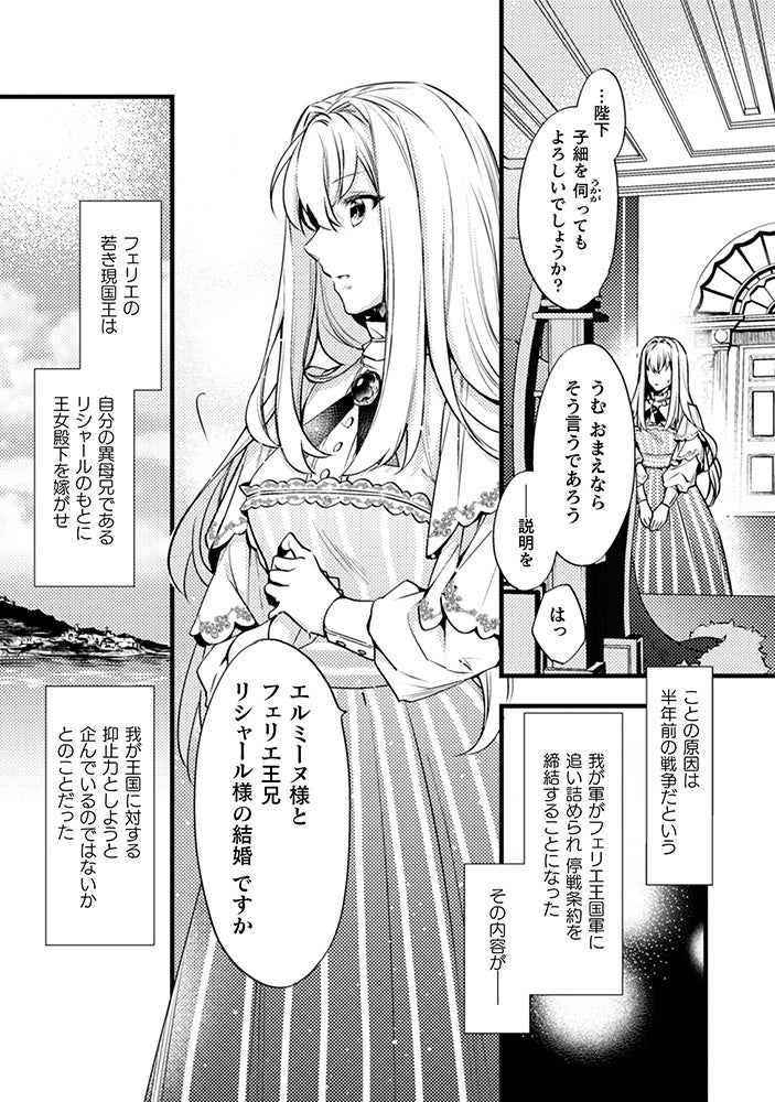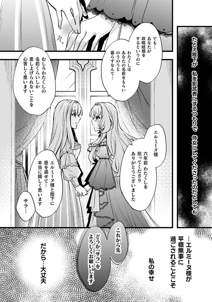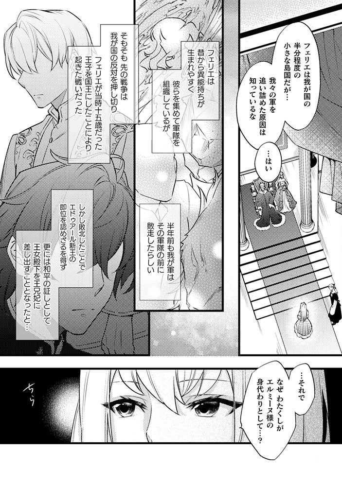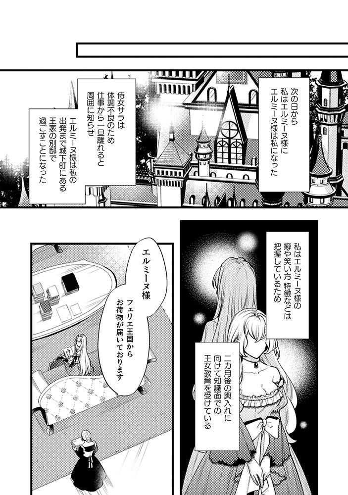 王女エルミーヌの影武者として、敵国フェリエの王兄との政略結婚を命じられた王女付きの侍女サラ。