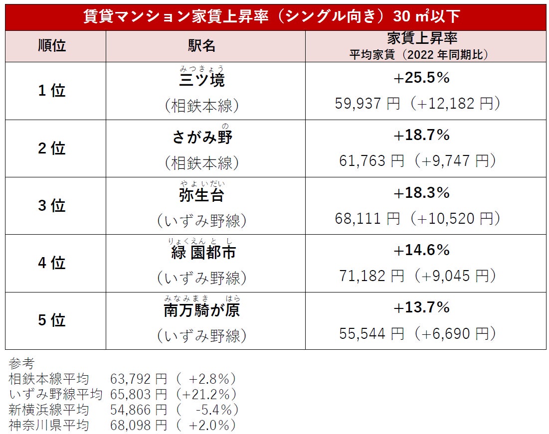 賃貸マンションは、シングル向きが「三ツ境」(同+25.5%)、ファミリー向きが「いずみ野」(同+53.2%)
