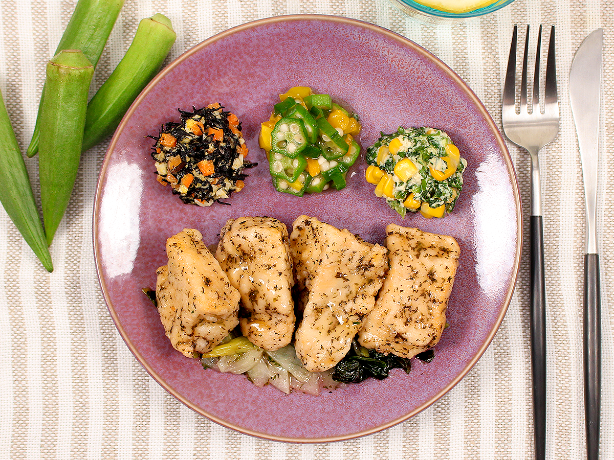 副菜はひじきの卵サラダ、黄パプリカの入ったオクラのおひたし、春菊の白あえです。