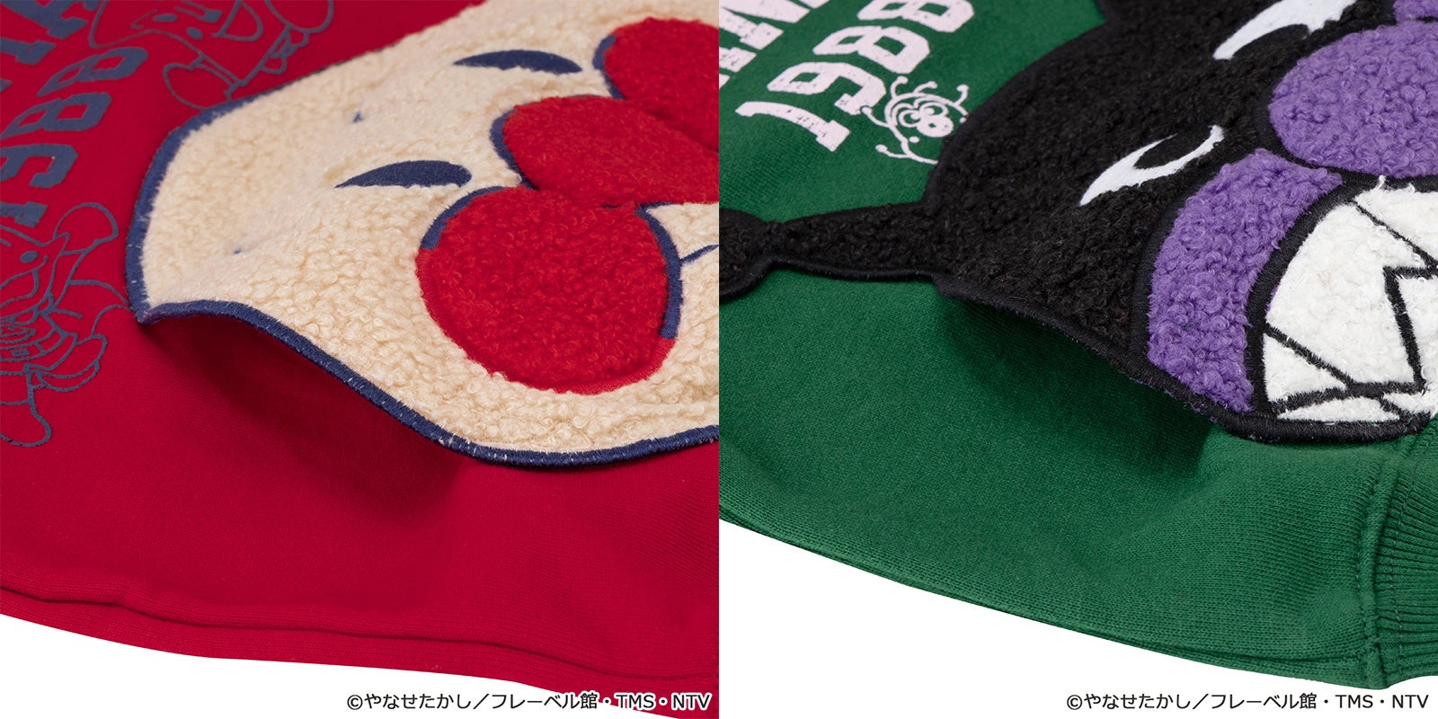 レッドはアンパンマン、グリーンはばいきんまんがアップリケでデザインされています。アップリケ生地にはもこもこしたボア生地を使用しており立体的な仕上がりに。