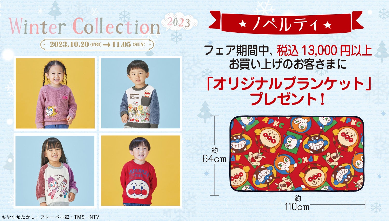 また、商品の発売にあわせて、店頭およびバンダイナムコグループ公式通販サイト「プレミアムバンダイ内アンパンマンキッズコレクションオンラインショップ」( https://p-bandai.jp/anpanman-kids/ )にて対象商品を13,000円(税込)以上お買い上げのお客様に「オリジナルブランケット」をプレゼントするキャンペーンを実施いたします。