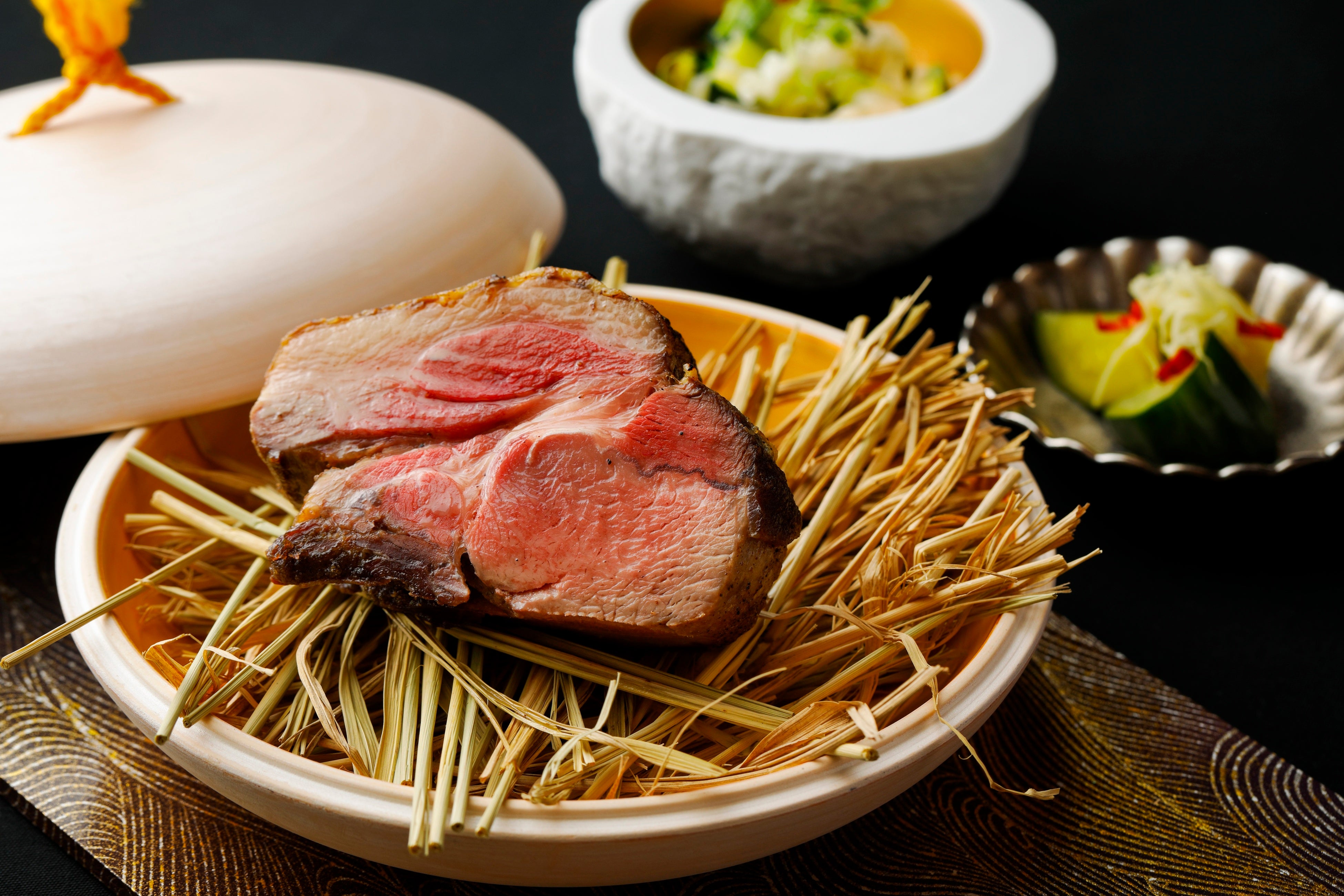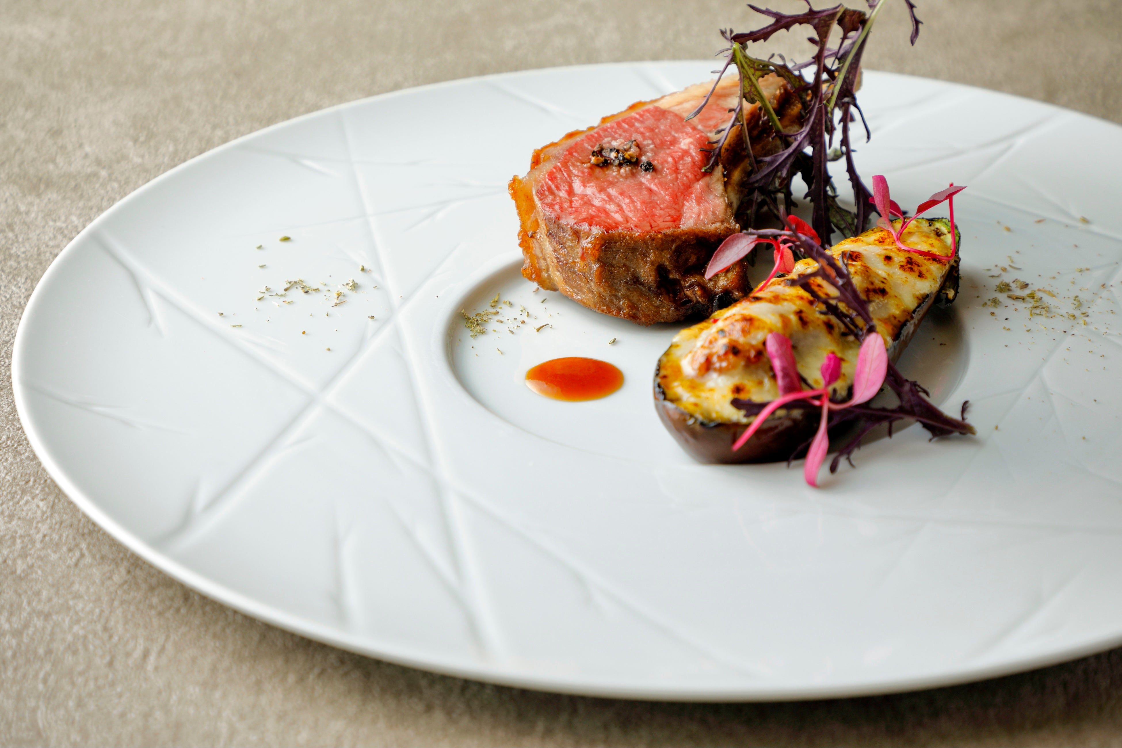 南仏プロヴァンスのハーブの香りを移したオーストラリア産仔羊のローストに、仔羊のラグーとグリュイエールチーズをのせて焼き上げ、京山科なすのグラタンを添えた一皿。