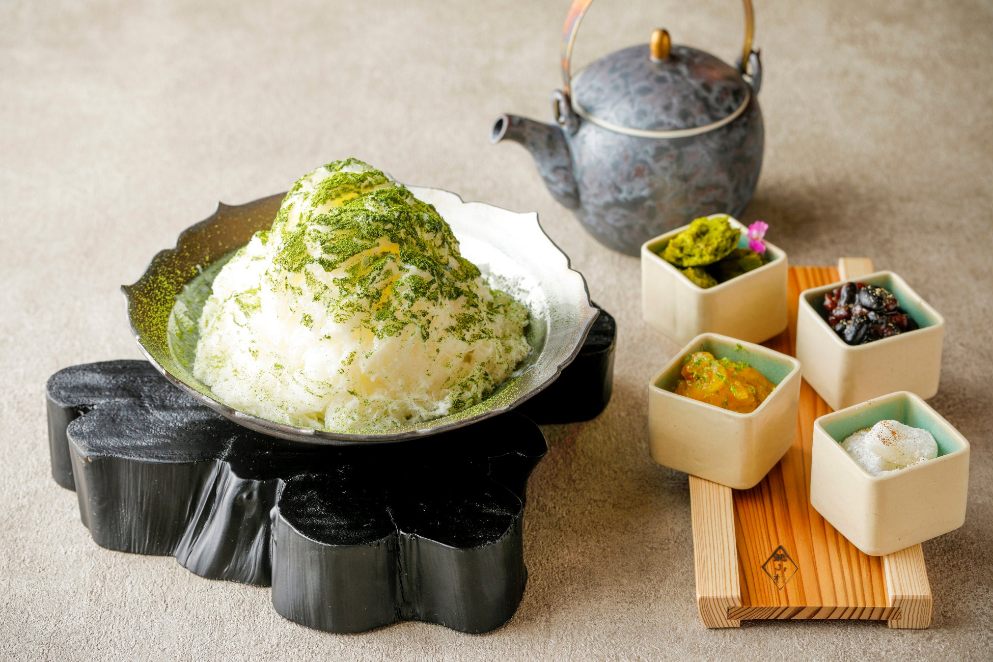 濃厚ミルクアイスを削り、香り高い宇治抹茶パウダーで仕上げたシェイブアイス。純白なミルクシェイブアイスの