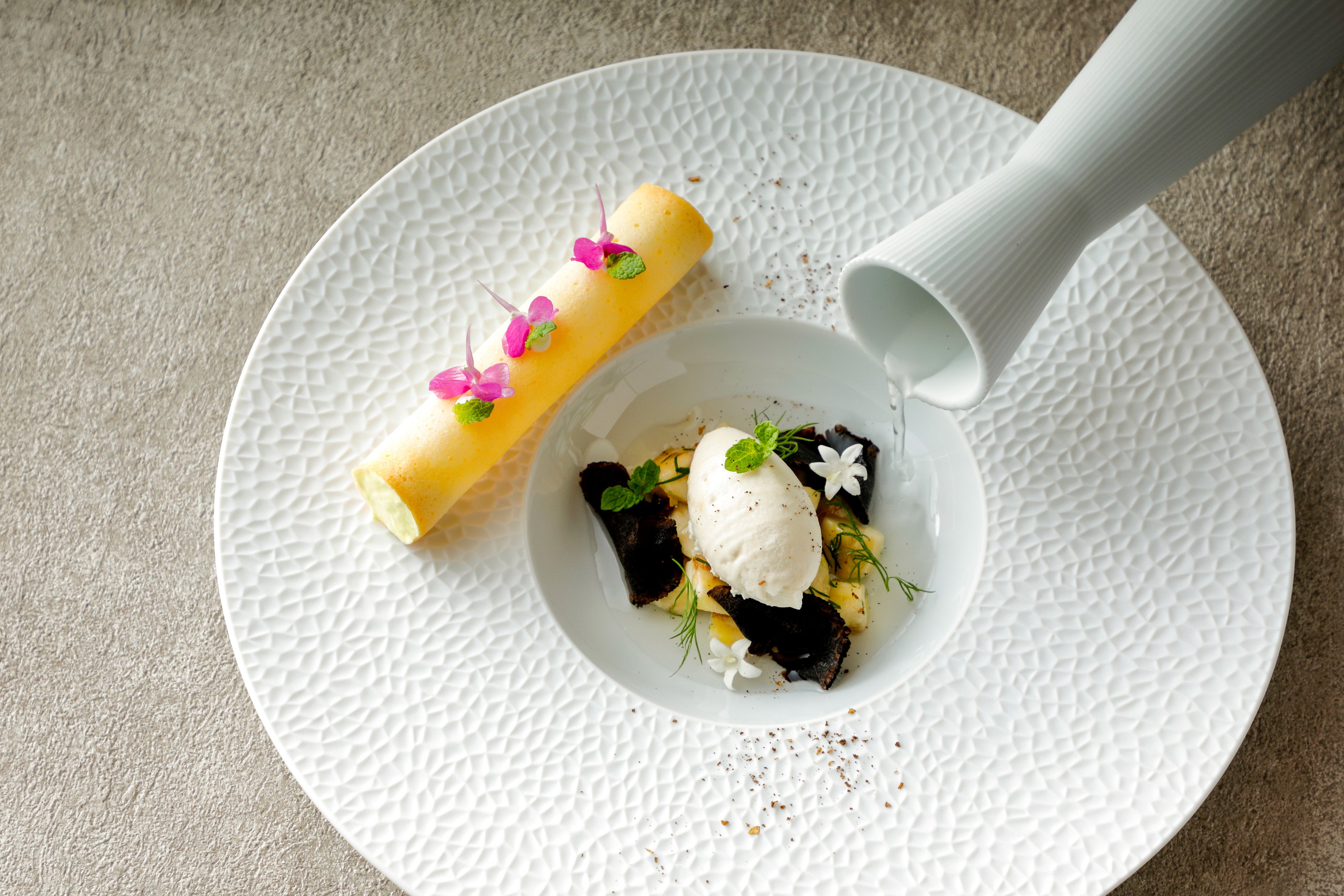 バナナの甘み、ディルの爽やかさ、トリュフの香り、パッションフルーツの酸味が溶け合う、夏らしいデザート。クリアなミントスープをかけてお召し上がりください。
