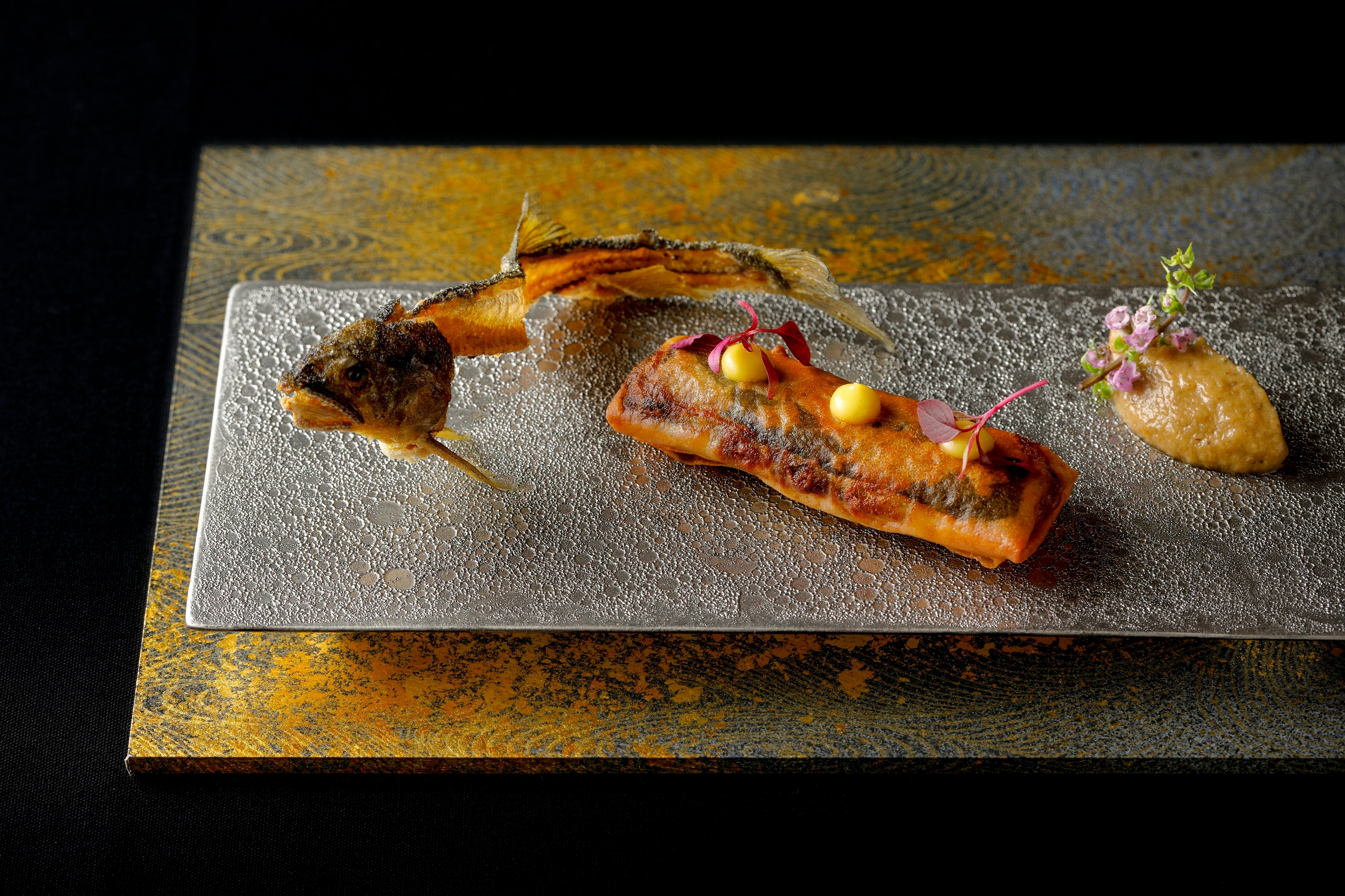 柔らかくコンフィにした鮎の身と賀茂なすを閉じ込めた春巻きにはレモンピューレをアクセントに。フレンチの技法、和の食材、中華の調理法を掛け合わせたこだわりの一皿です。