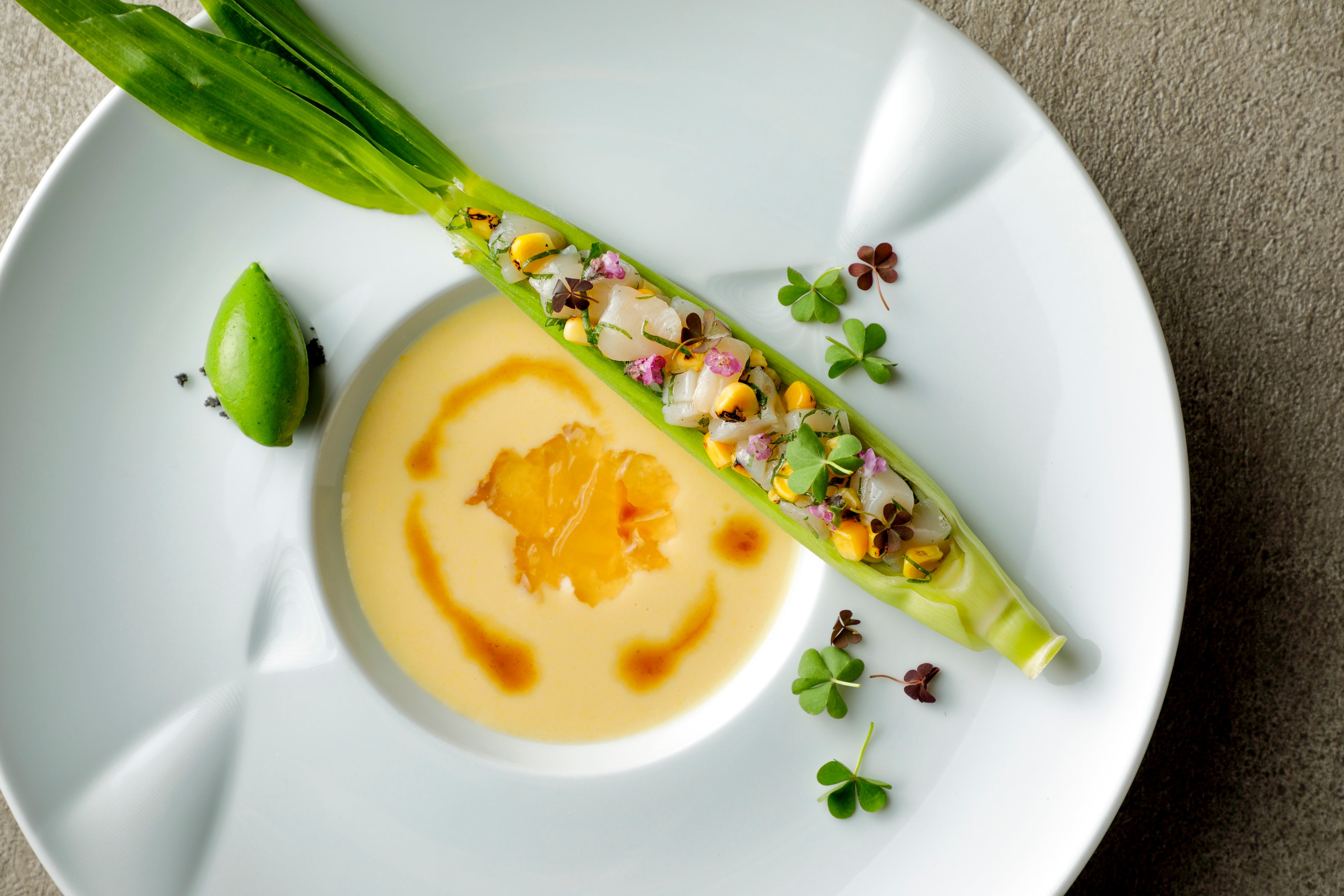 グリルとうもろこしと帆立貝のタルタルを添えた、京都産とうもろこしの冷製スープ。コーヒーのオイルをアクセントにたらし込み、爽やかな紫蘇のアイスを添えてご提供いたします。
