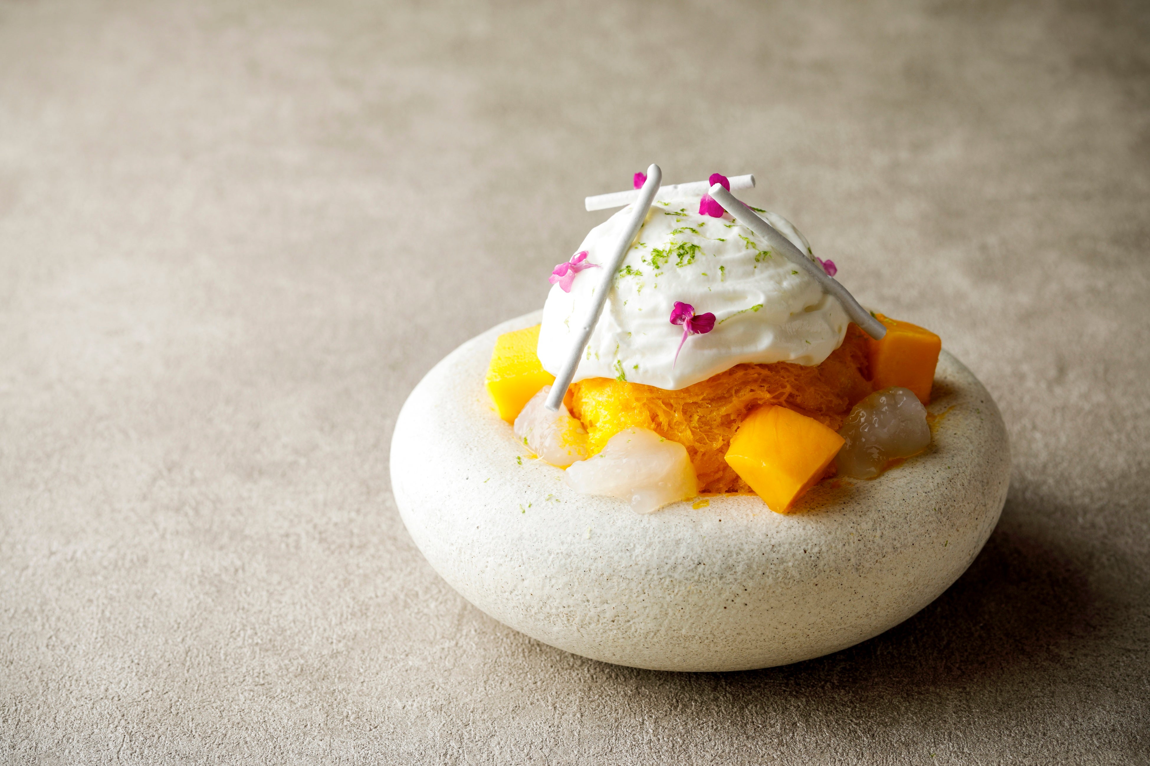 杏仁とココナッツのなめらかなパンナコッタに、芳醇な香りのアップルマンゴーアイスで作るきめ細やかなシェイブアイスを削りかけ、その上から優しい酸味のヨーグルトエスプーマをかけたトロピカルな一品。仕上げに、濃い甘みのフレッシュマンゴーと、爽やかなレモングラス香る自家製わらび餅を散りばめました。