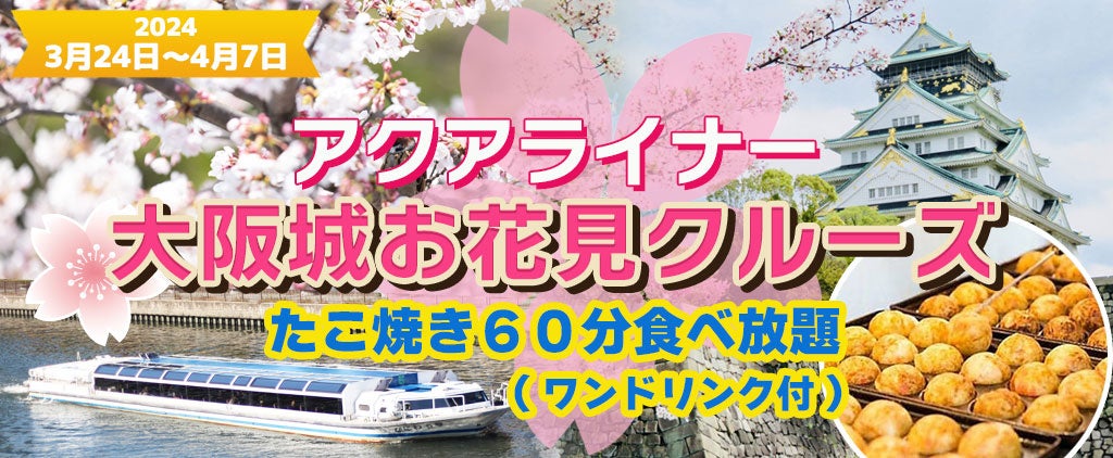 3月24日~4月7日限定!お一人様¥3,980- 春季限定水都大阪の定番お花見クルーズ 《13:30発》水上バス アクアライナー 大阪城お花見クルーズ +たこ焼き60分食べ放題(ワンドリンク付)