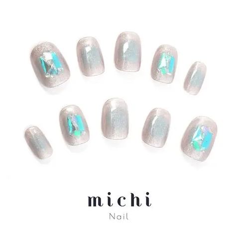 見ているだけで涼しくなれる寒色系チークネイル。オーロラフィルムやホログラムを使うことで、クールでちょっぴり近未来っぽいデザインに仕上がっています。夏のイベントで大活躍間違いなしです!