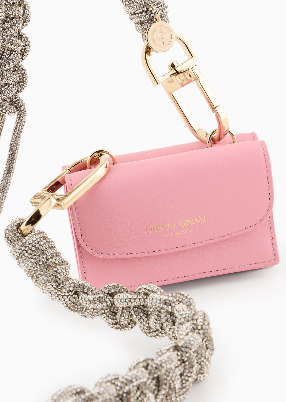 ウィメンズからはアイコンバッグ「ジョルジオ アルマーニ ラ プリマ」シリーズのミニサイズの三つ折りウォレットをご紹介します。エレガントなピンクのカラーに、シルバーのラインストーンの取り外し可能なショルダーストラップが美しく映え、存在感を放ちます。