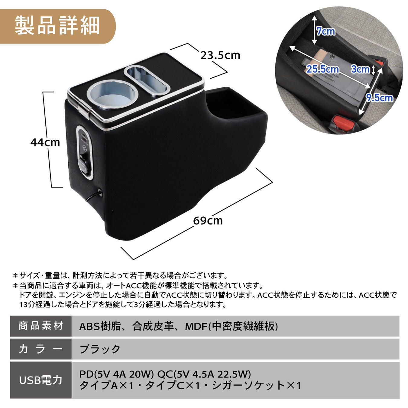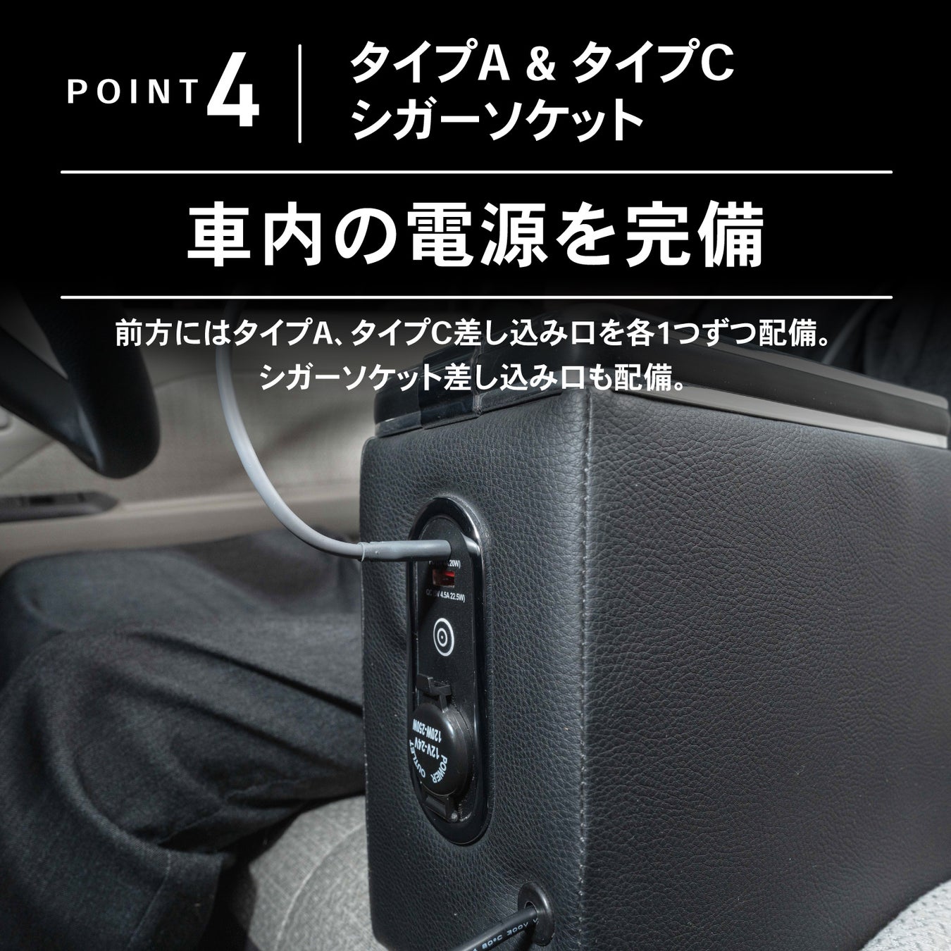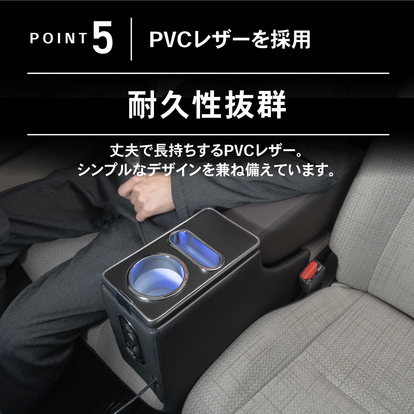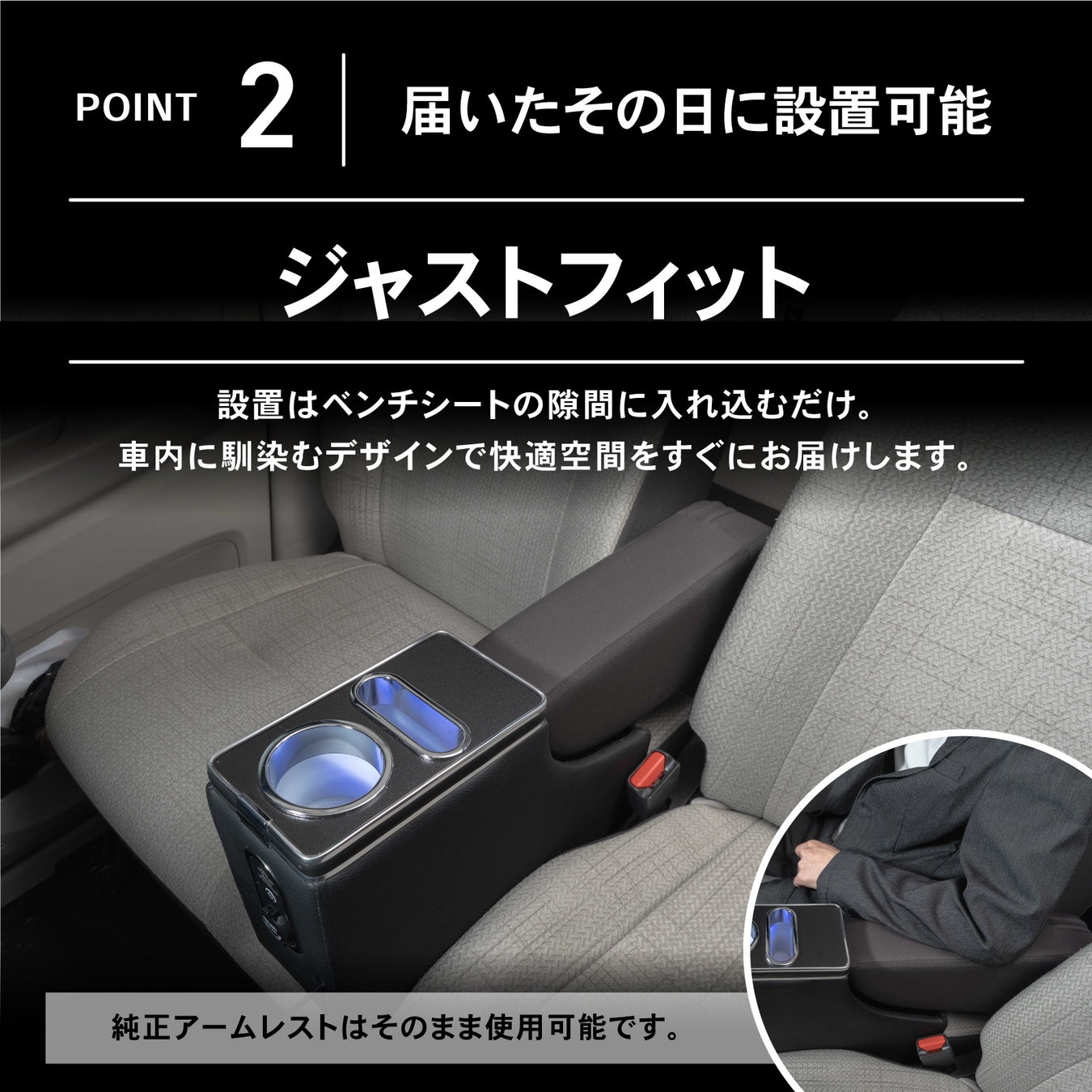 デリカミニ eKスペース ルークス専用LEDアームレスト/コンソールボックス。隙間に入れ込むだけの簡単設置で散らかる小物をすっきり収納。タイプA、タイプCシガーソケットを完備。夜も安心のLED。