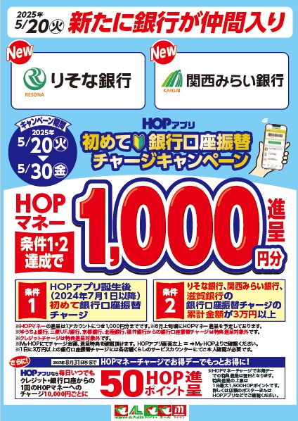 りそな銀行、関西みらい銀行が新たに仲間入りしたことを記念し、初めての銀行口座振替チャージをご利用いただいた方に1,000円分のHOPマネーを進呈するキャンペーンを開催いたします。