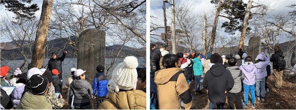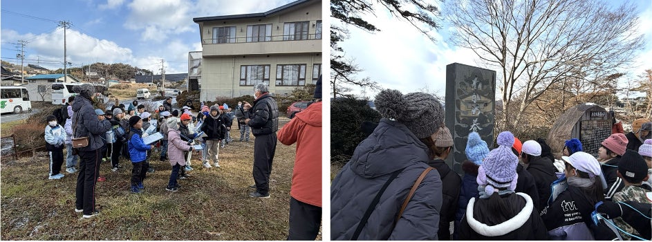 わかめ養殖発祥の碑では、地元わかめ漁師の吉田力男さんによる講話が行われました。大船渡の漁業の歩みや、地域の漁業を支えてきた“郷土の偉人”たちの功績について紹介され、児童たちは地域の歴史に触れました。