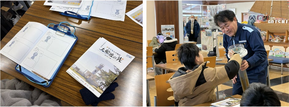はじめに碁石海岸レストハウスでは、釜石海上保安部交通課・中村正幸さんによる講話が行われ、大船渡市内の全小学校、全児童に向け配布したオリジナルパンフレットと総合学習用ワークシートを活用し、海の安全を守る灯台の役割や歴史について分かりやすく解説され、児童たちは熱心に耳を傾けていました。