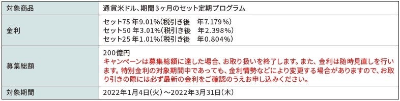 ソニー銀行株式会社(代表取締役社長:南 啓二/本社:東京都千代田区/以下 ソニー銀行)は、2022年1月4日(火)より、2つのキャンペーンを実施しますのでお知らせいたします。