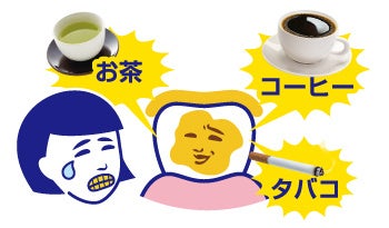 お茶やコーヒーに含まれる色素やたばこのヤニなどが、歯の表面のタンパク質と結びついて着色。