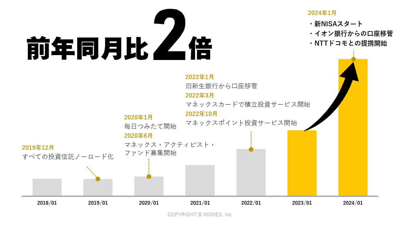 これらの取組みによって投資信託の積立額が順調に推移した結果、2024年1月の月間積立額は一年間で倍増いたしました。