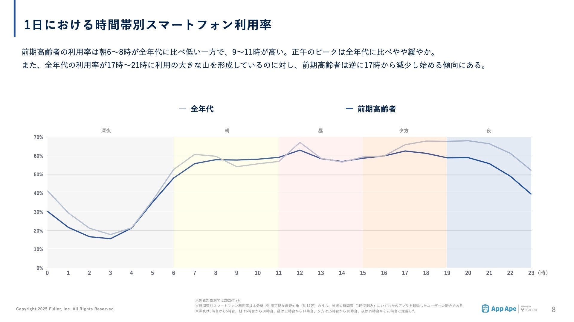 前期高齢者のスマートフォン利用率は朝6〜8時が全年代に比べ低い一方で、9〜11時が高く、正午のピークは全年代に比べやや緩やかでした。