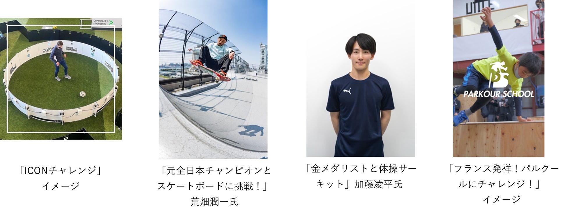 「YOYOGI-PARK スポーツチャレンジ」では、3つのスポーツにチャレンジができます。「金メダリストと体操サーキット」では、体操男子日本代表としてオリンピックや世界選手権で数々の金メダルを獲得した加藤凌平氏と一緒に、跳び箱や鉄棒などのサーキットにチャレンジします。「元全日本チャンピオンとスケートボードに挑戦!」では、スケートボード界のレジェンド、荒畑潤一氏が直接レクチャーを行い、初めての子どもからもっとうまくなりたい子どもまで楽しめます。「フランス発祥!パルクールにチャレンジ!」では、パルクールコーチと一緒にBOXやレールを飛び越えたり、くぐったり、自由な発想で自分だけの動きを創り出す、ダイナミックな体験が可能です。