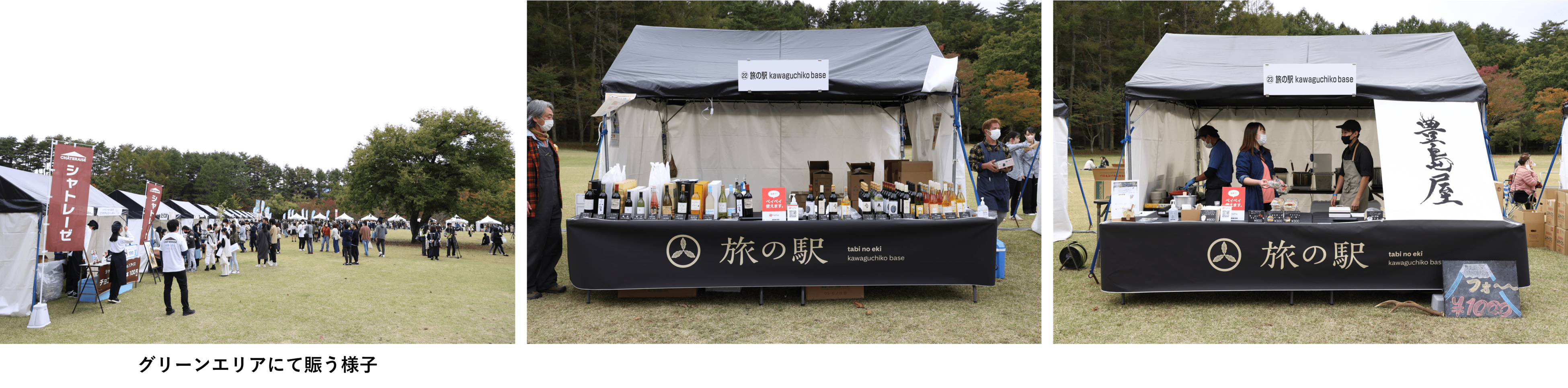 「旅の駅 kawaguchiko base」は、多様な旅人を受け入れ、富士河口湖町の滞在型観光を推進する拠点として2022年6月にオープン。富士河口湖町が持つ観光地ならではの地域課題を見つけ解決し、SDGsの理念の元、持続可能な観光地(地域)づくりを行う基点となる場を創出することを掲げています。グリーンエリアのブースでは、山梨県産ワインの飲み比べや富士北麓フォーといった地産品を販売しました。