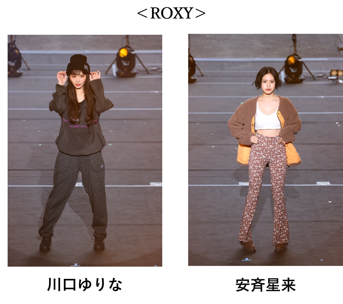 そして、ビーチカルチャーとアクティブライフスタイルを愛する女性のためのブランドROXYは、自然を楽しむアウトドアスタイルを提案するファッションショー。撥水加工アイテムが多数登場し、出口夏希、ひまり、川口ゆりな、Niki、安斉星来らが着用しました。