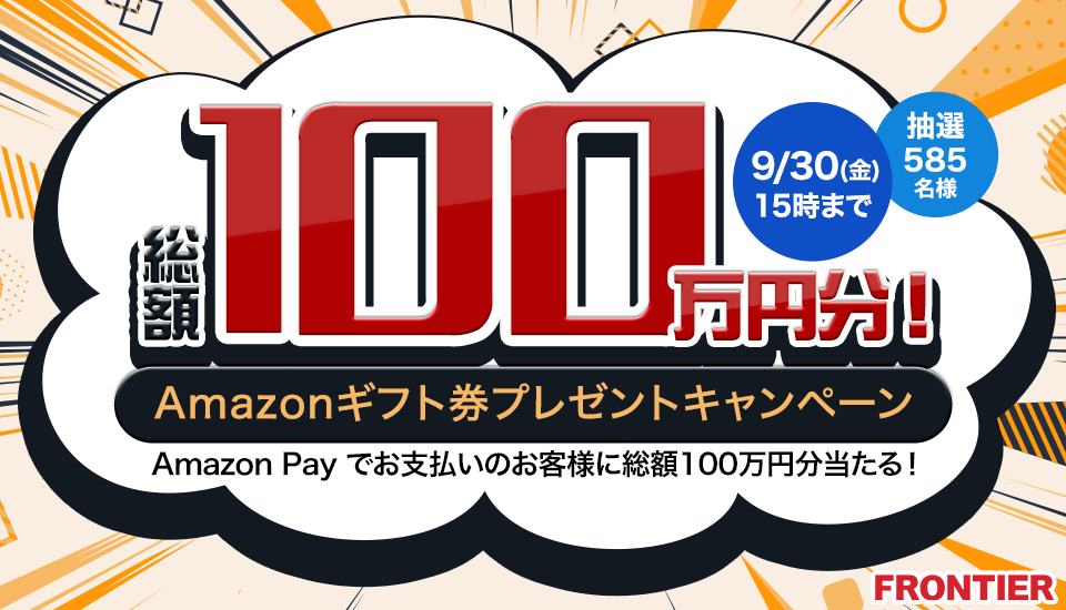 このたびFRONTIERダイレクトストアでは、キャンペーン期間中にAmazon Payを利用して一度のご購入金額 50,000円(税込)以上のご注文の中から、抽選で585名様に総額100万円分のAmazonギフト券をプレゼントするキャンペーンを開始いたしました。ぜひお得にお買い物をお楽しみください。