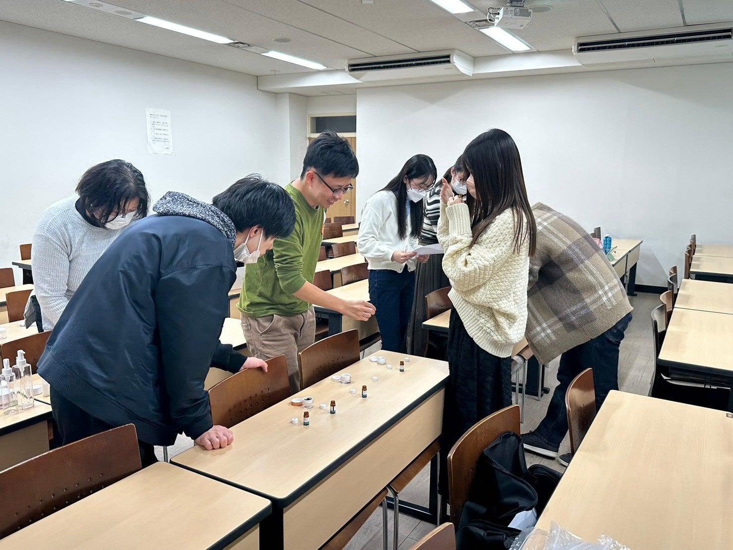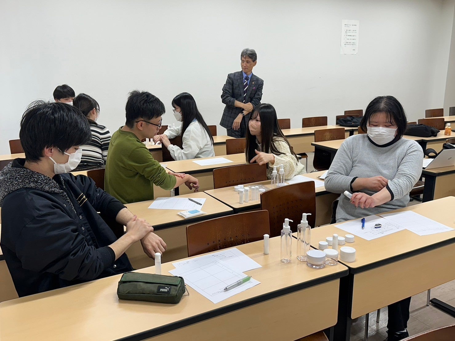 受講した学生からは、「脱毛に興味があったので、種類など知れてよかった」、「自分と相手の求めるコスメの好みがしっとりとさっぱりで真逆で新しい発見だった」、「香りや容器を選ぶのが楽しかった」といった感想をいただくことができました。