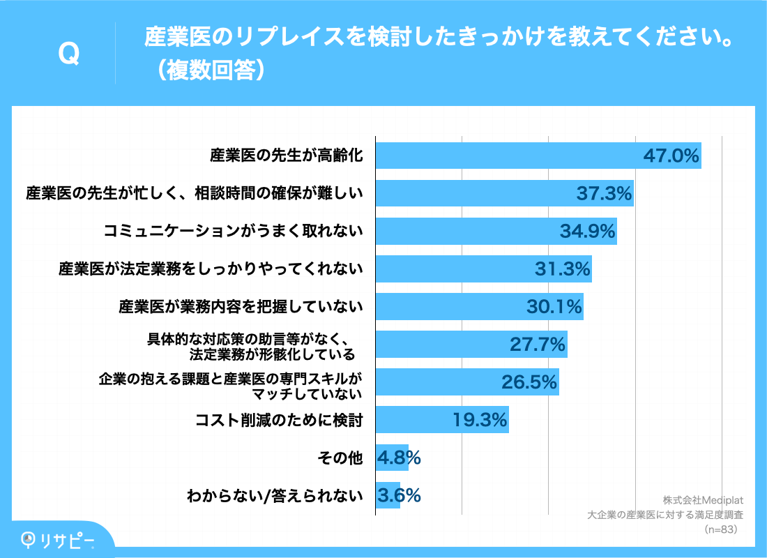 さらに、現在の産業医に満足していない方もしくは、産業医のリプレイスを実施または検討したことがある、と回答された方に、「産業医のリプレイスを検討したきっかけ」を調査しました。その結果「産業医の先生が高齢化(47.0%)」「産業医の方が忙しく、相談時間の確保が難しい(37.3%)」「コミュニケーションがうまく取れない(34.9%)」という回答となっています。