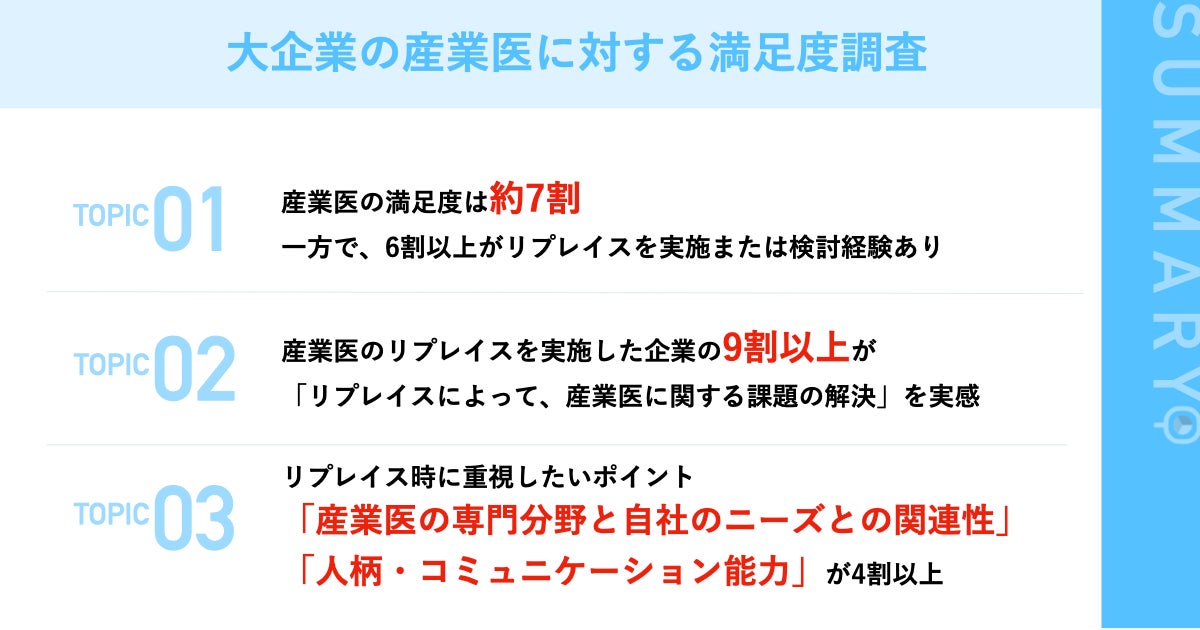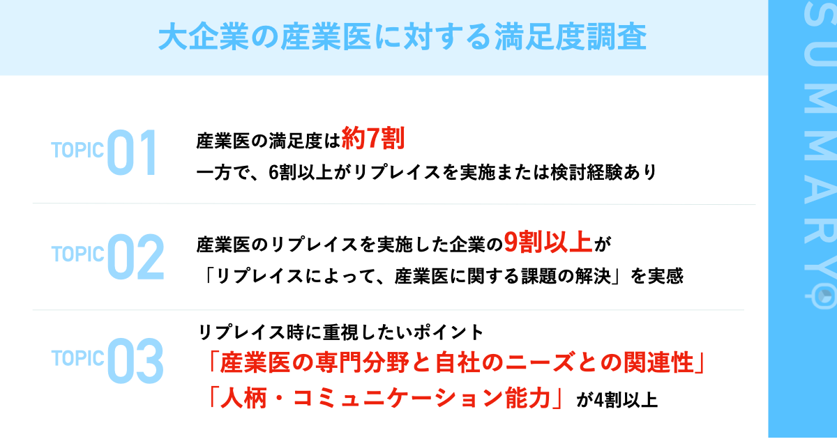 【大企業の産業医に対する満足度調査】約7割が産業医に満足も6割以上が過去にリプレイス実施または検討経験あり