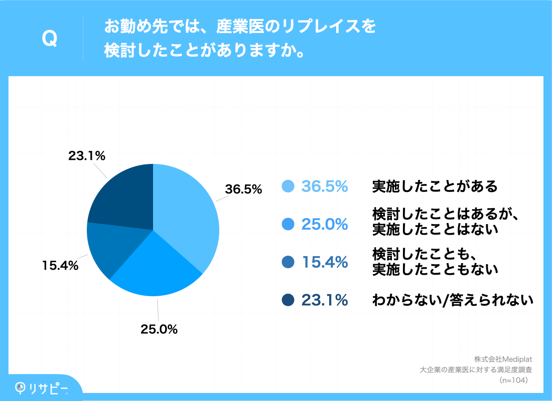 次に「産業医のリプレイスを検討したことがあるか」について調査した結果、「実施したことがある(36.5%)」、「検討したことはあるが、実施したことはない(25.0%)」とリプレイス実施や検討経験のある企業が6割以上(61.5%)という回答になりました。
