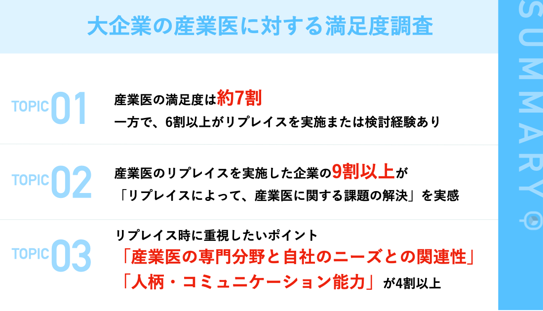 今回の調査では、産業医の高齢化などをきっかけに産業医のリプレイスを検討する企業が多く、リプレイスを実施した企業では産業医に関する課題が解決したという実態が明らかになりました。近年、労働環境の改善や従業員の健康を重視する動きが強まる中、産業医の役割はますます重要になっています。産業医に関する課題を解決するためには、産業医導入支援企業のサポートのもと、自社のニーズに合った産業医に巡り会うことが重要ではないでしょうか。