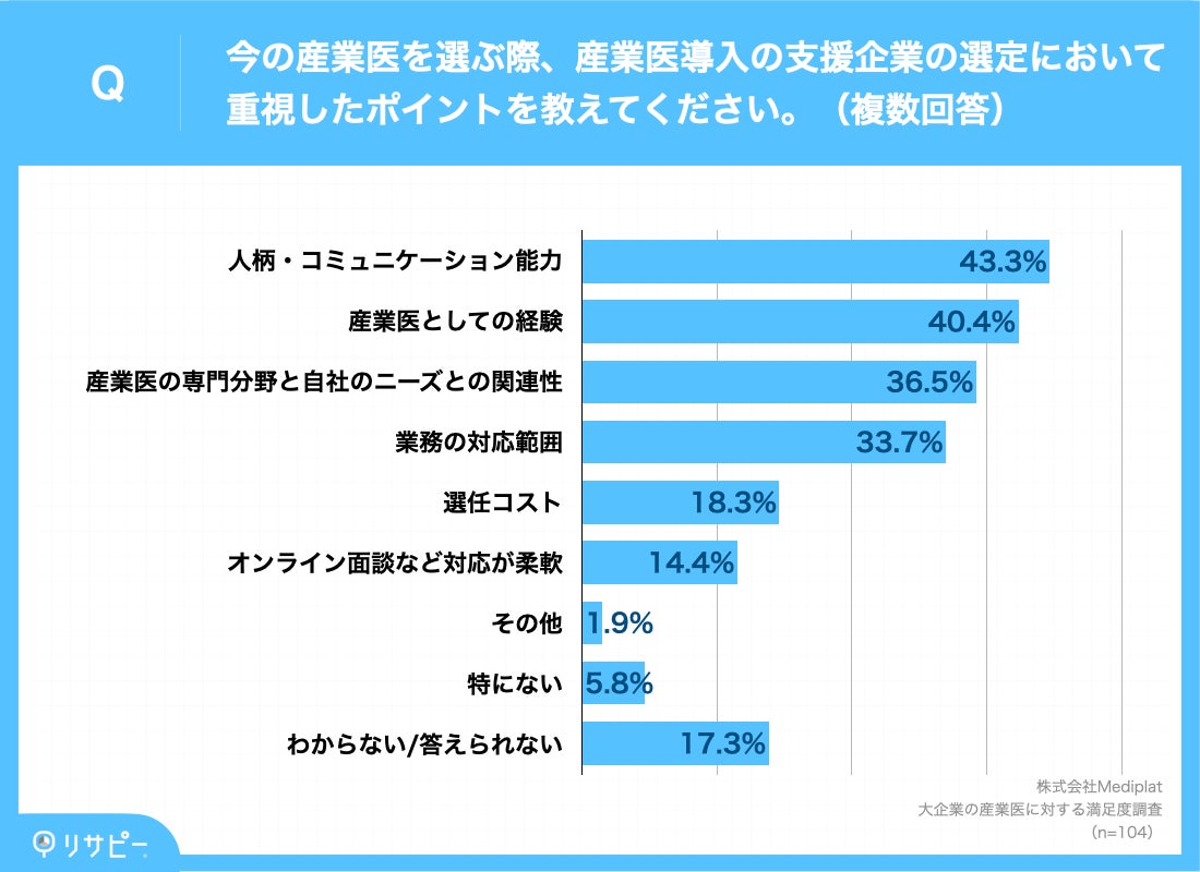 続いて、「今の産業医を選ぶ際、産業医導入の支援企業の選定において重視したポイント」を調査したところ、「人柄・コミュニケーション能力(43.3%)」「産業医としての経験(40.4%)」「産業医の専門分野と自社のニーズとの関連性(36.5%)」という回答となりました。