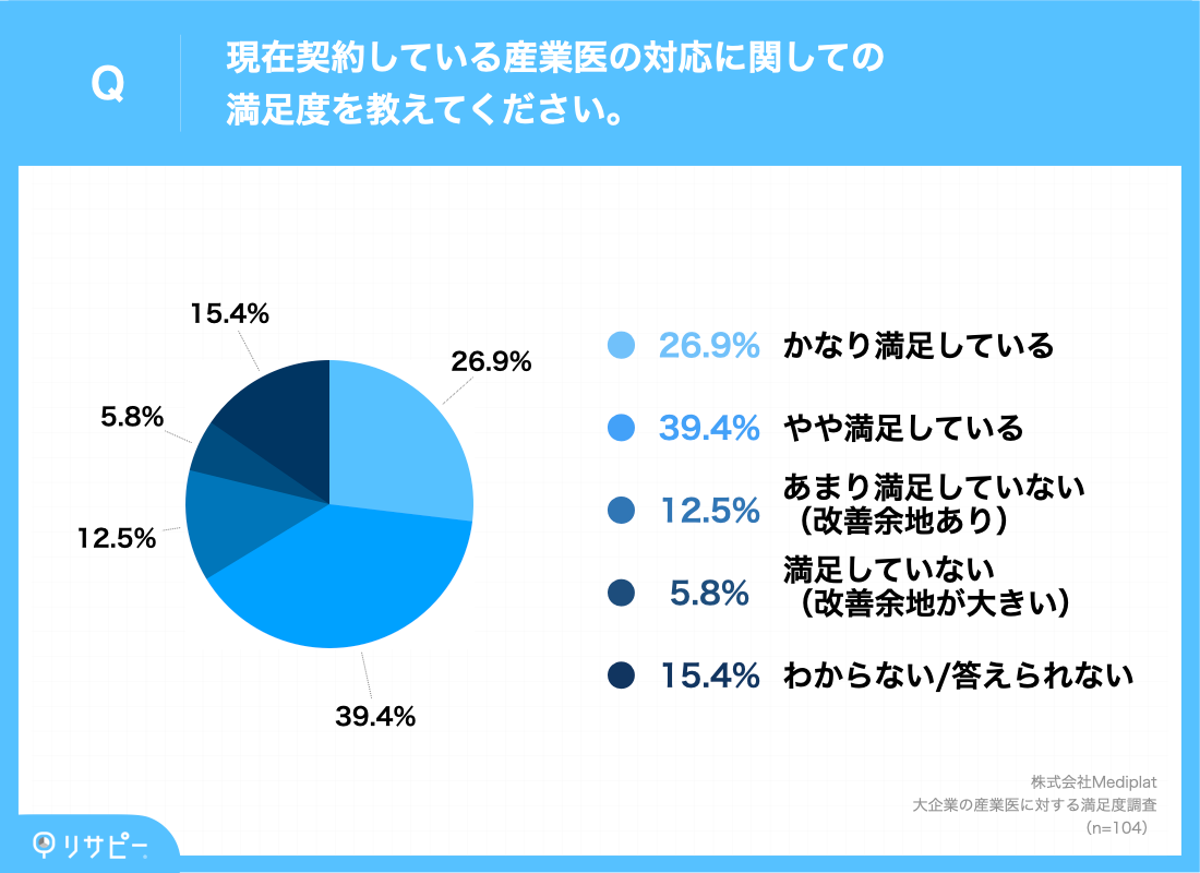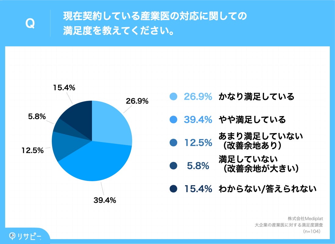 今回は、大企業(従業員数1,000名以上)の経営者・人事責任者104名を対象に、「大企業の産業医に対する満足度調査」を実施しました。