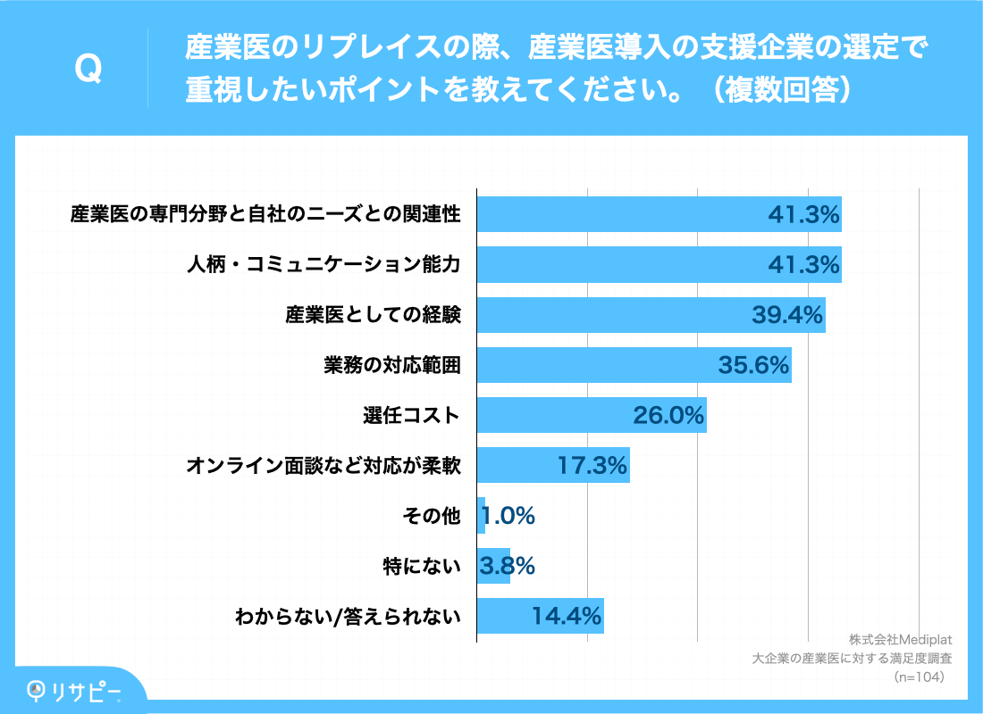 さらに、その調査結果と比較して、大企業の経営者・人事責任者は産業医のリプレイスの際、産業医導入の支援企業の選定においてどういったポイントを重視するのか調査しました。その結果、「産業医の専門分野と自社のニーズとの関連性(41.3%)」「人柄・コミュニケーション能力(41.3%)」が並び、「産業医としての経験(39.4%)」と続いています。