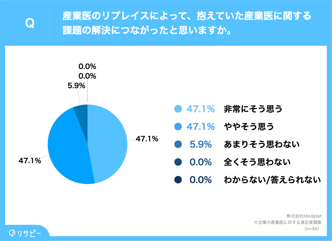 産業医のリプレイスを実施したことがある企業はリプレイスの結果、課題の解決につながったのでしょうか。調査の結果、「非常にそう思う(47.1%)」「ややそう思う(47.1%)」と9割以上(94.2%)が課題の解決につながったと感じていることがわかりました。