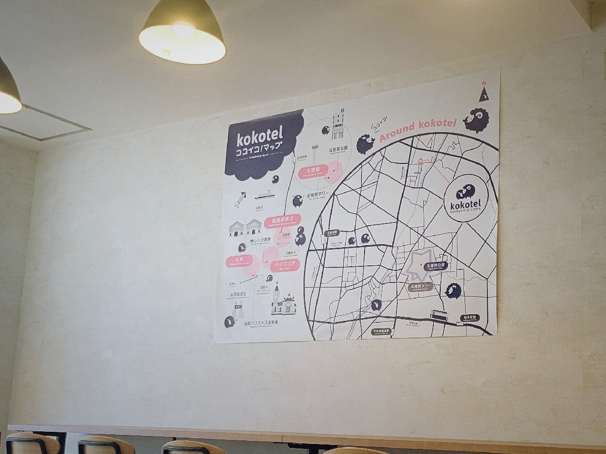 一つはお客様に函館の町をより堪能いただけるようオリジナル周辺ガイドマップ「ココイコ!マップ」を設置いたしました。ラウンジスペースあるウォールマップからQRコードを読み込んでいただくと、スタッフおすすめのグルメスポットが表示されるため、観光にもビジネス出張の際にも活用いただけます。