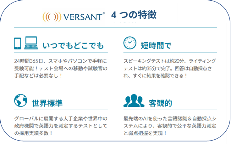 近年、日本の有力企業の多くでは、VERSANTとTOEIC LRテストを併用するケースが増えています。TOEIC LRで900点を超えても英語スピーキング力が苦手な方が多いことが分かってきているからです。伸ばしたい英語スキルを測るテストを選ぶ、評価と育成の一体化を進めることは、日本人がグローバルでの発信力を高める上で喫緊の課題です。